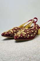- Indulge in timeless elegance with these spectacular Maroon Velvet Floral Bridal Slingbacks.