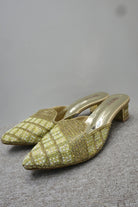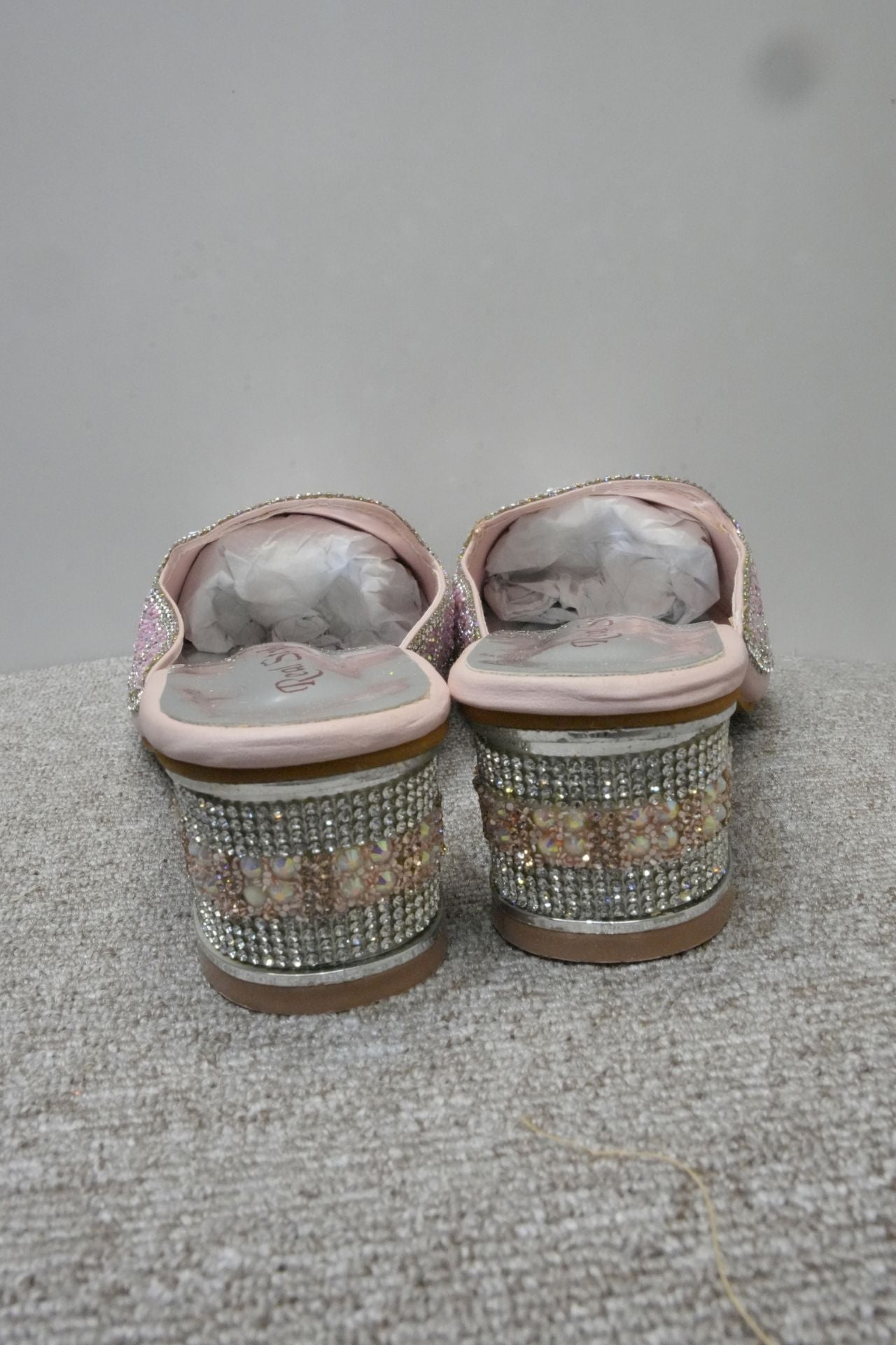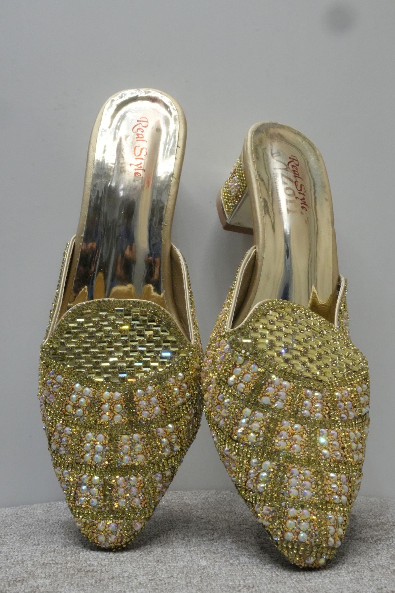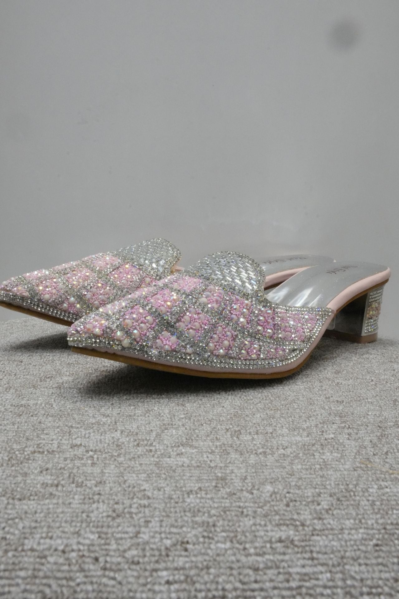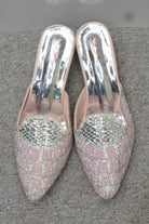 - These closed-toe mules are completely covered in an opulent mix of iridescent and silver-toned rhinestones, creating a mesmerizing, all-over shimmer.