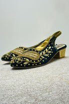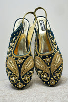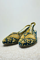 - Crafted from rich, deep Teal velvet, the closed toe is exquisitely adorned with intricate gold and silver-toned beadwork forming a beautiful central floral motif.