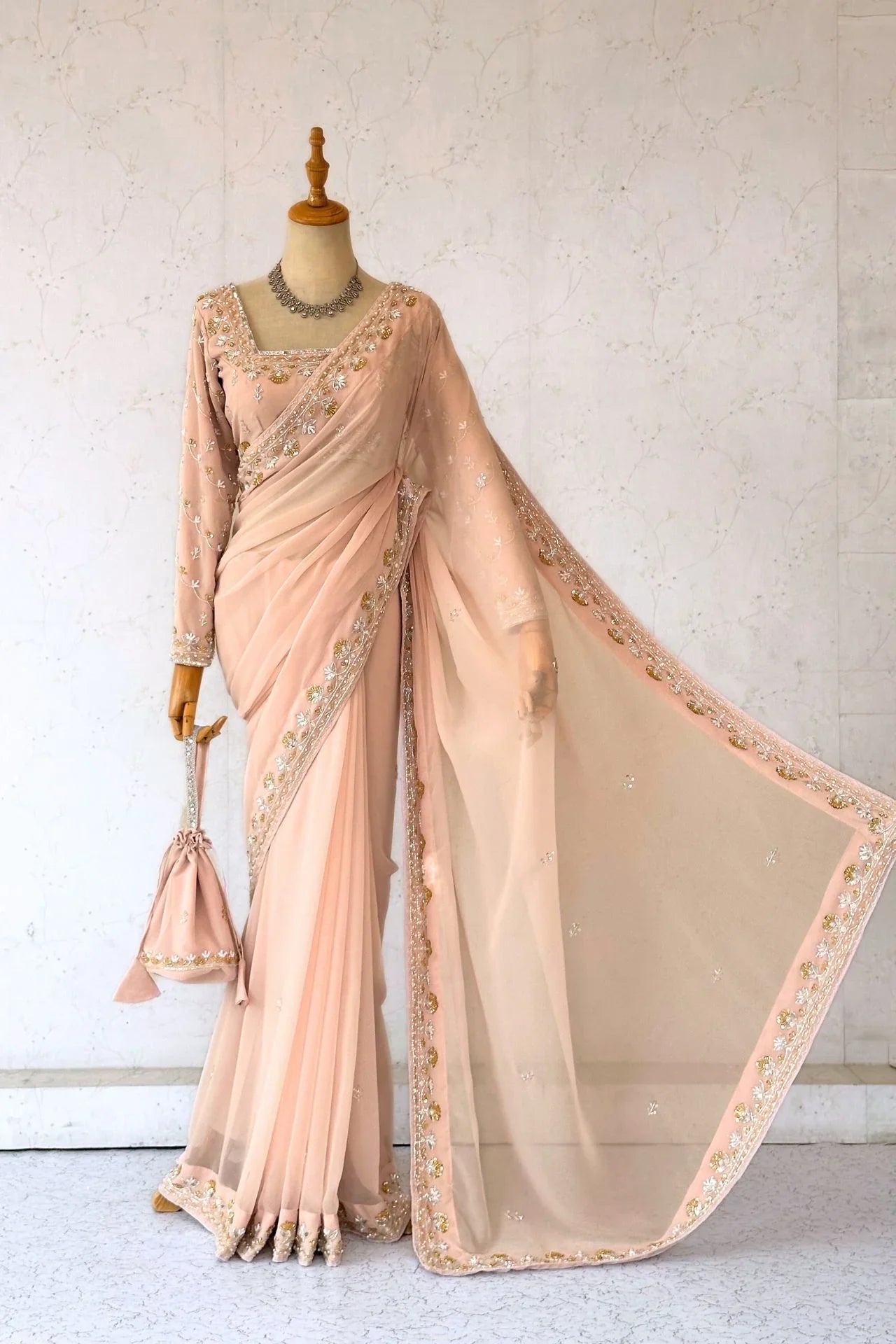 - Stones and cut dana embroidery work on Georgette saree with floral buttis