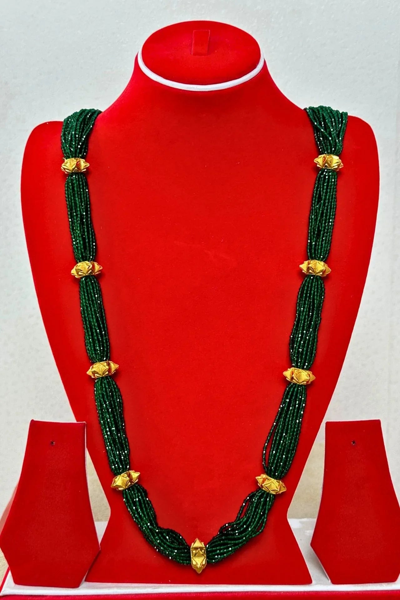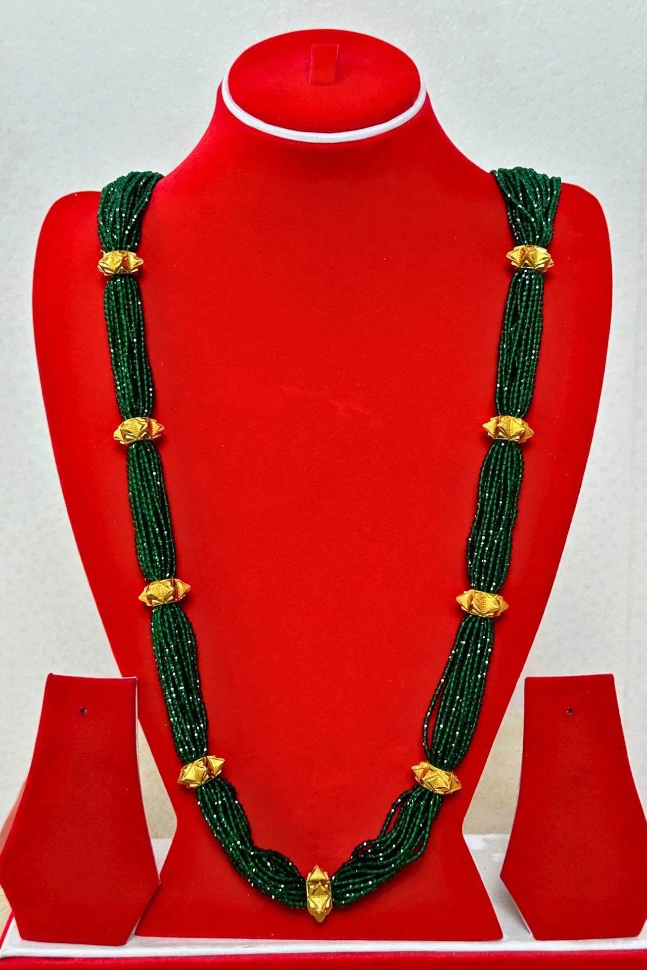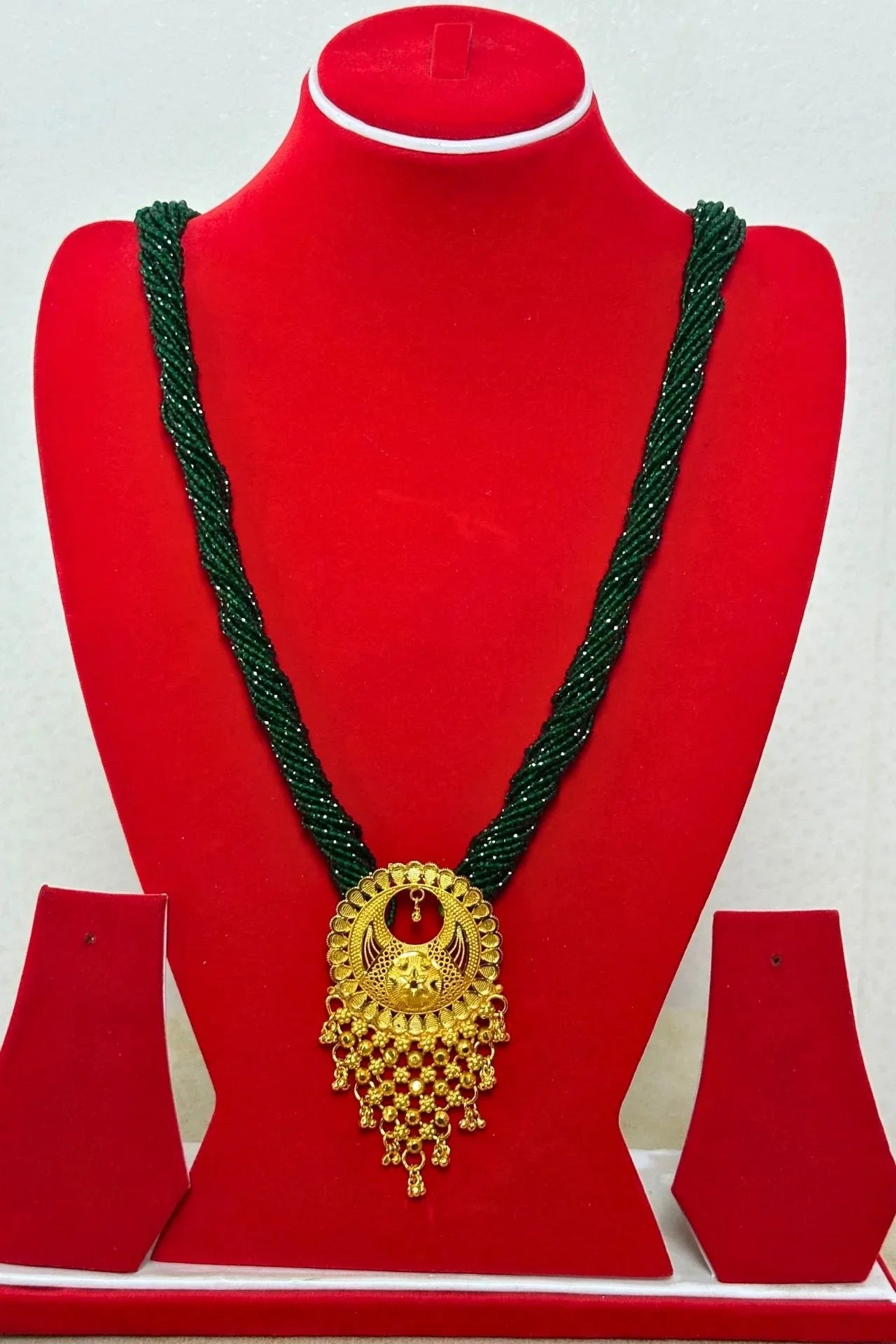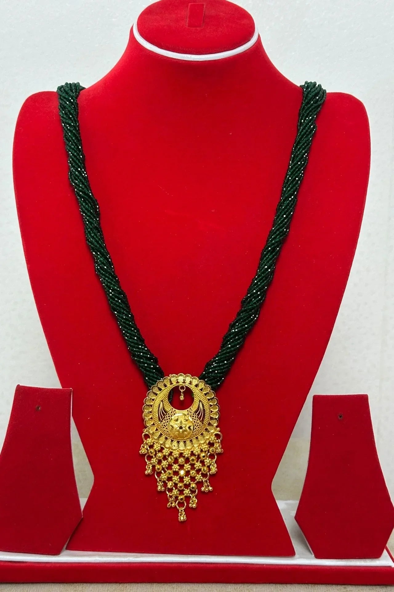 Gold-Plated Devotional Motif Pendant Necklace with Green Beads