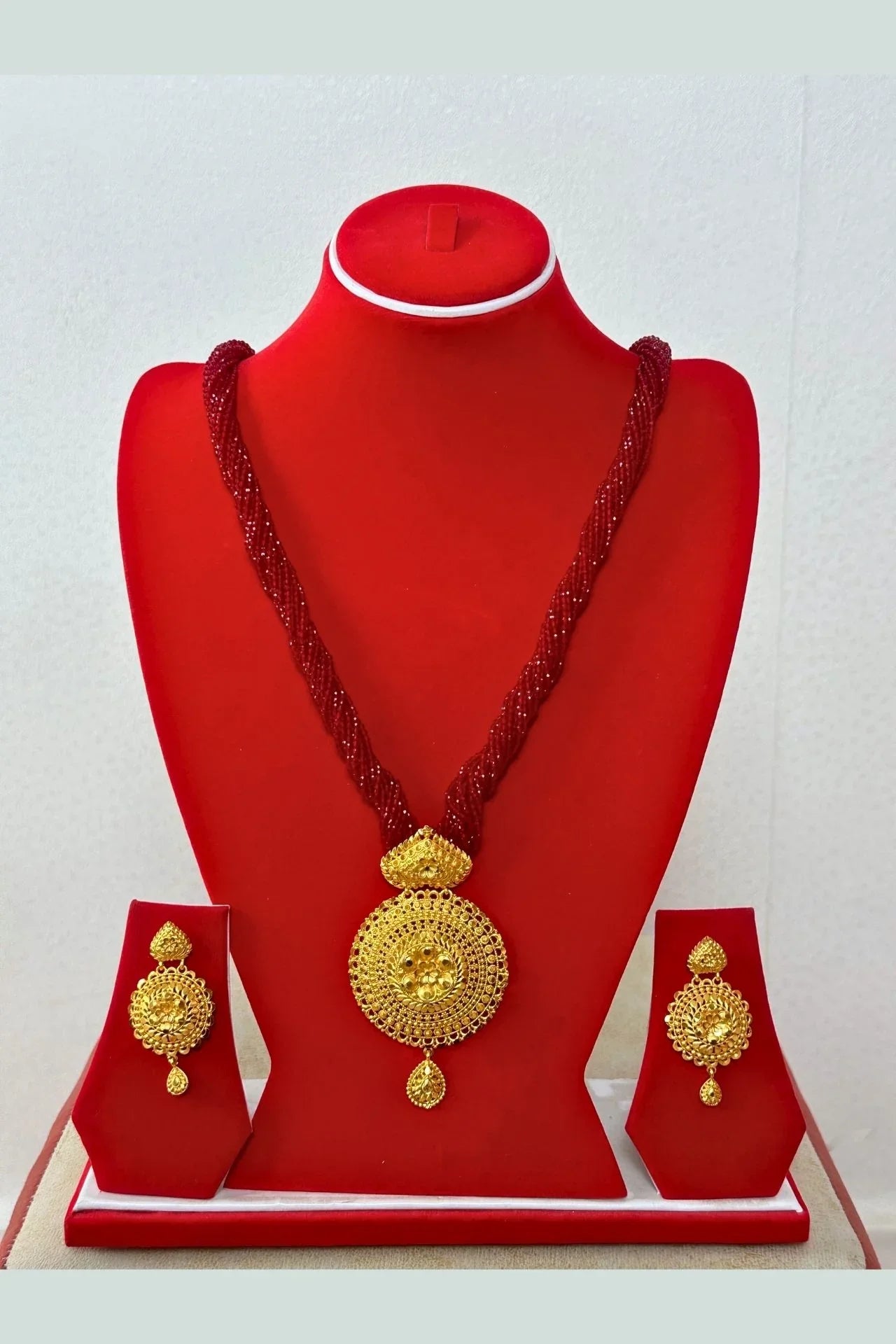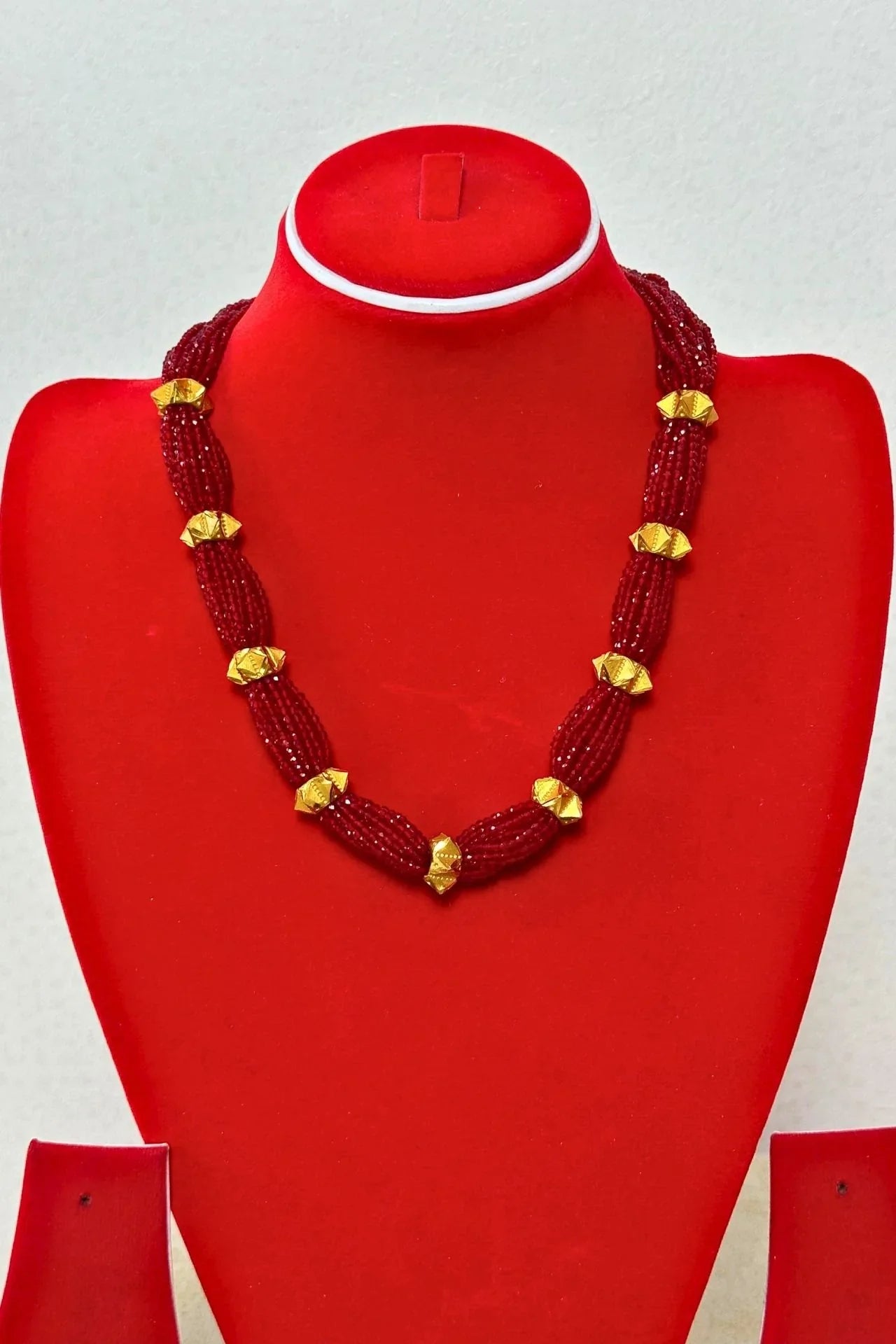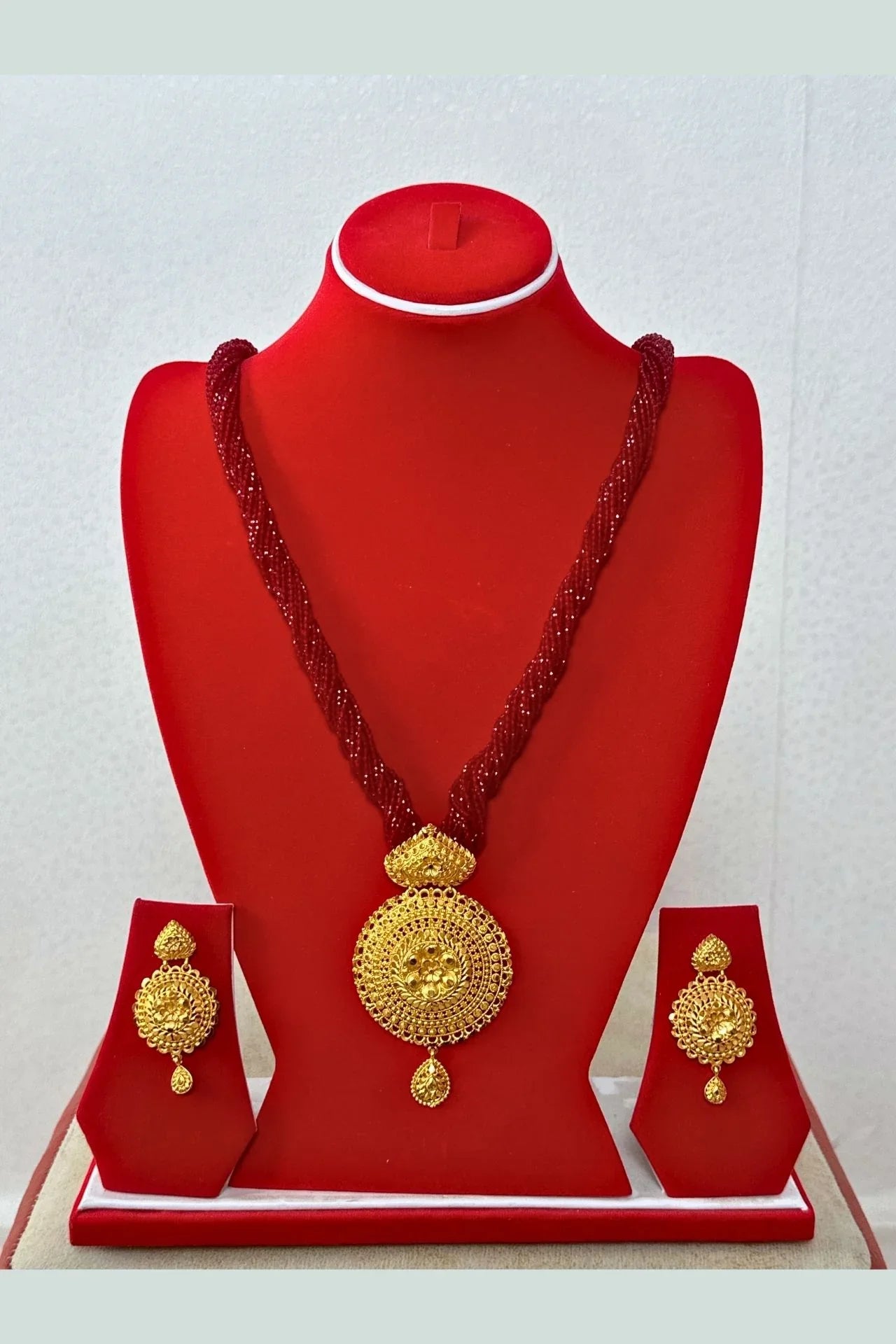 Gold-Plated Necklace & Earring Set with Maroon Beads