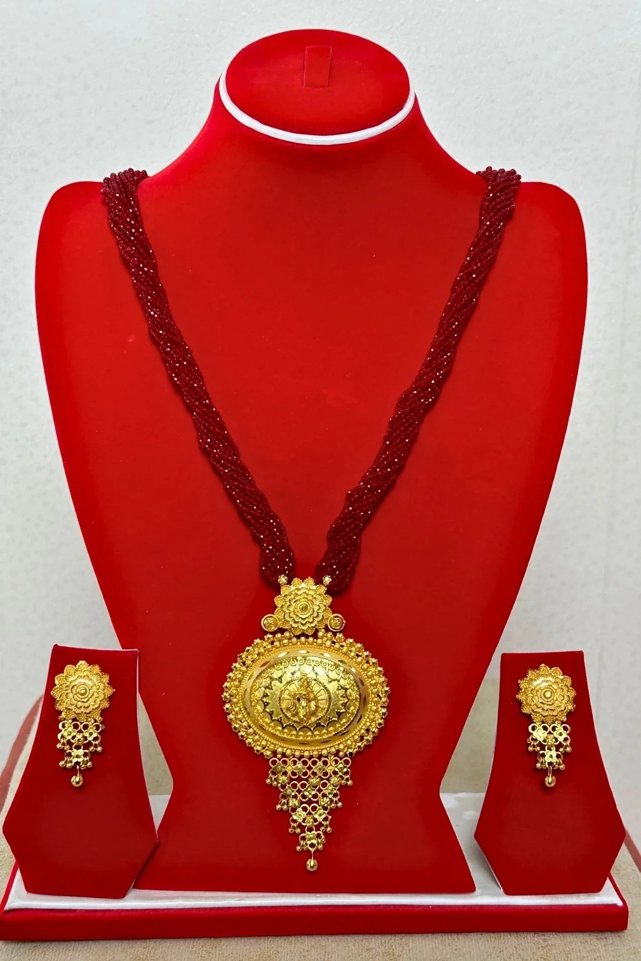 - Material: High-quality alloy with a gold-plated finish; multi-strand maroon beaded chain