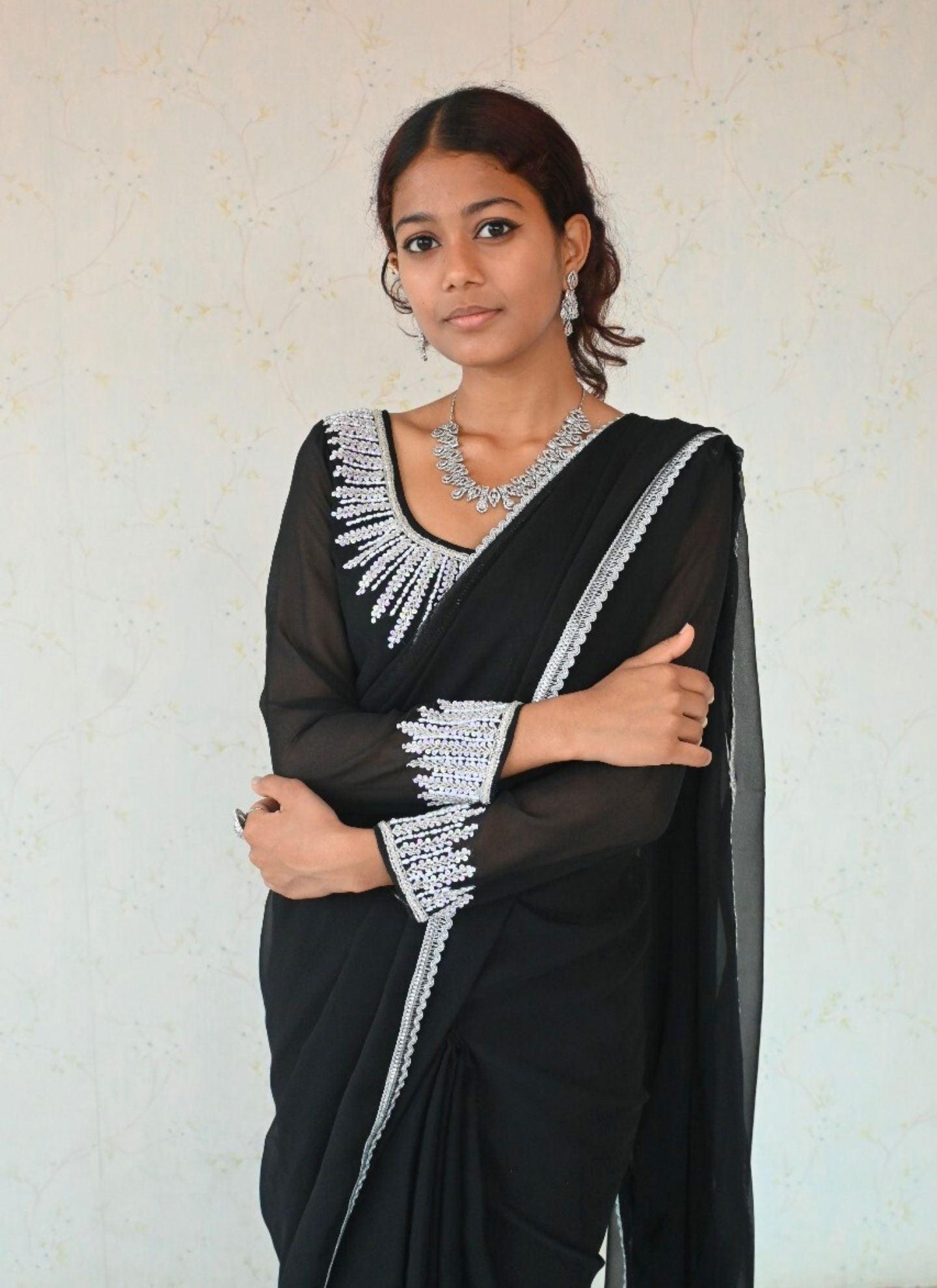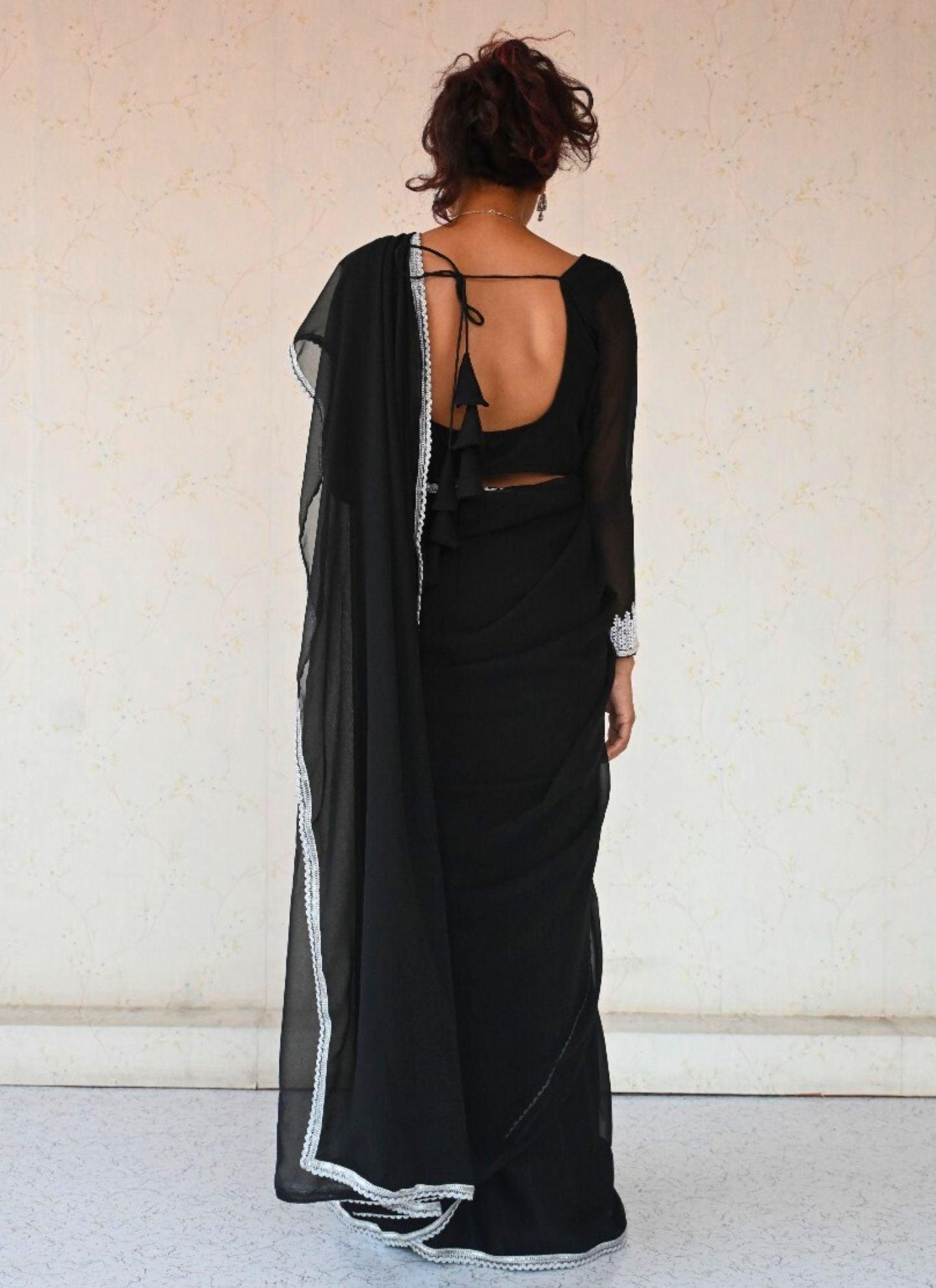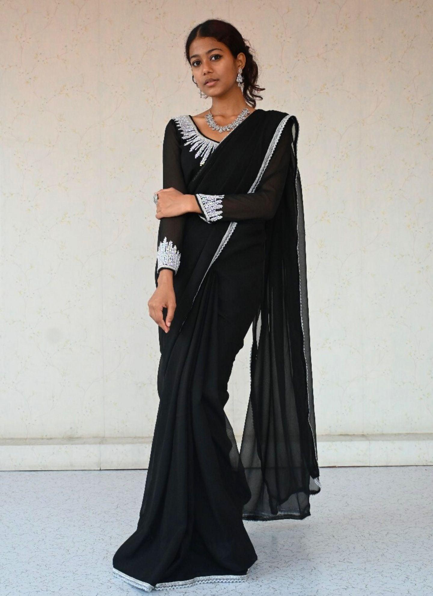 Black Georgette Pre Pleated Saree With Hand Work Blouse
