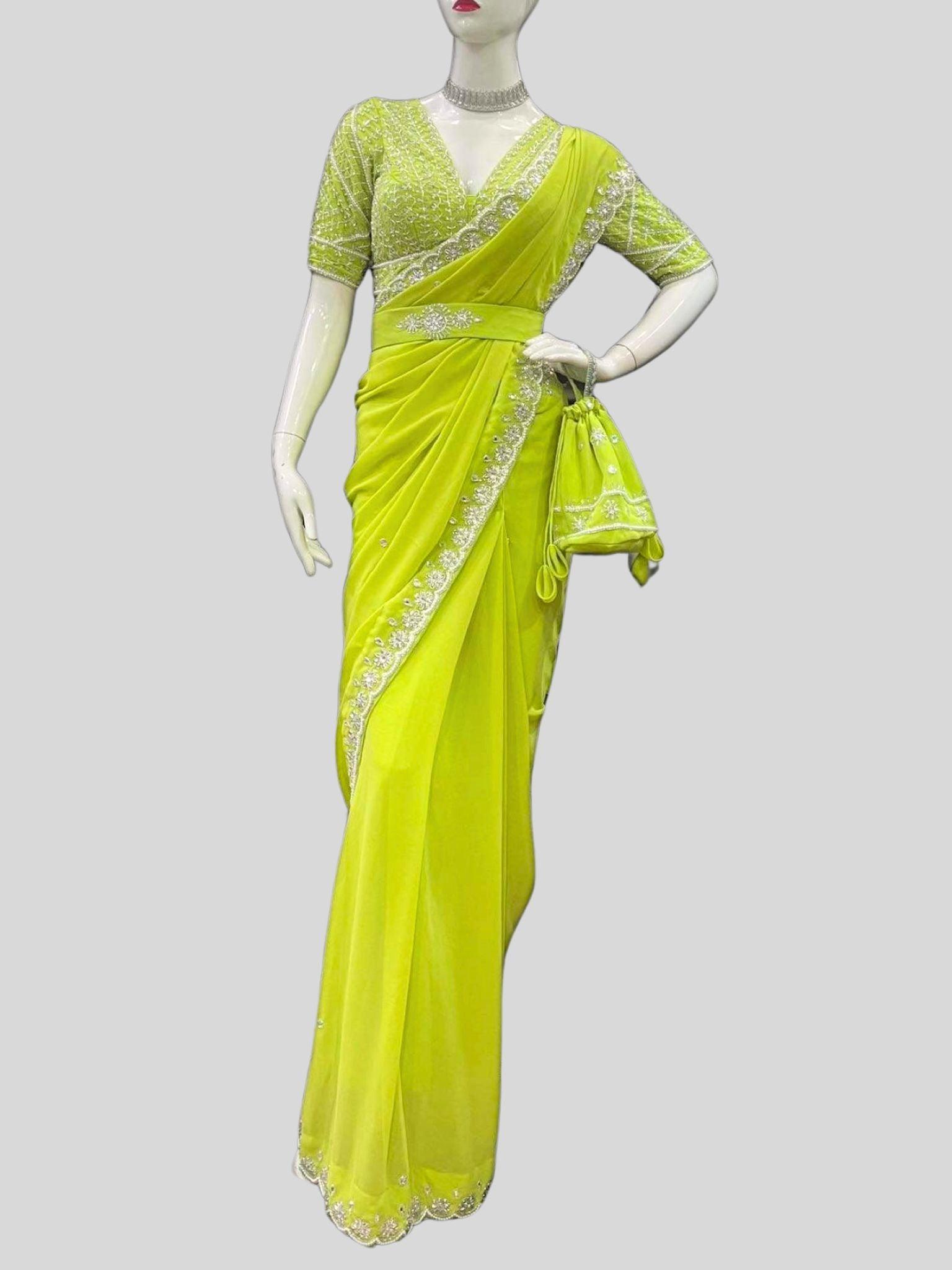 ParrotGreen Hand Embroidered Georgette Saree