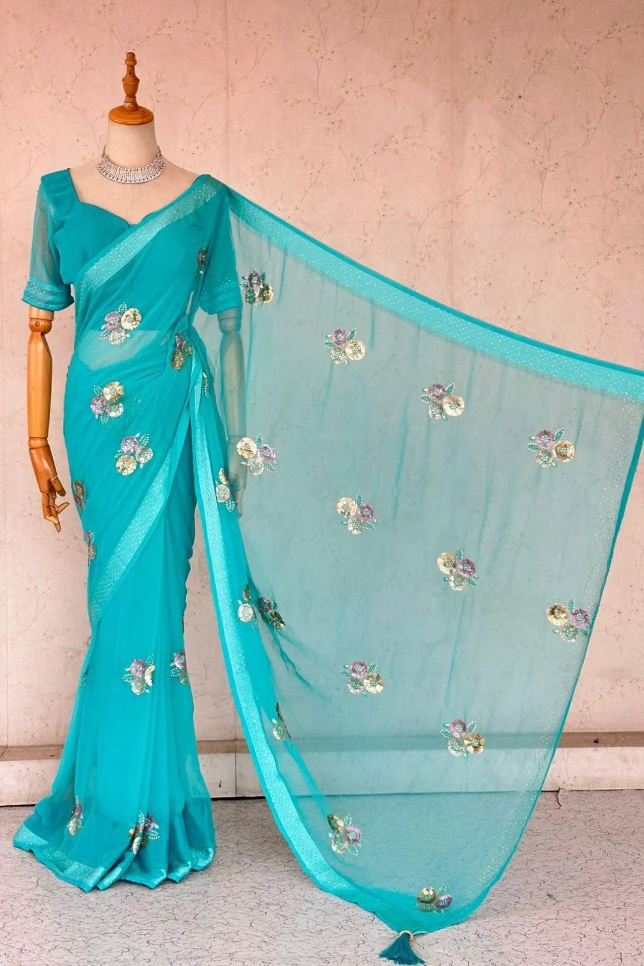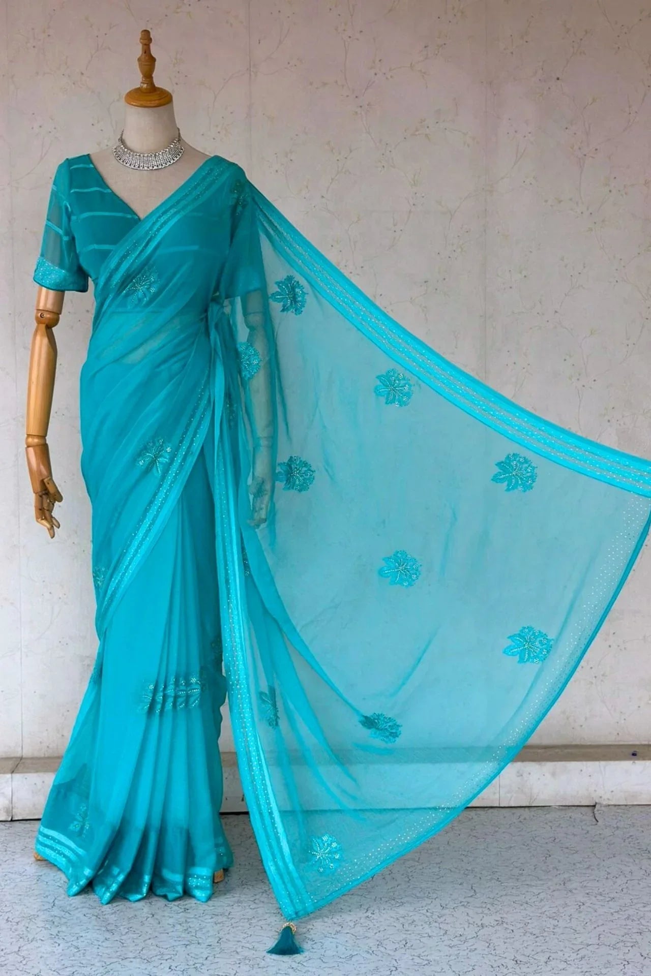 Turquoise Blue Embroidered Saree with Floral Motifs