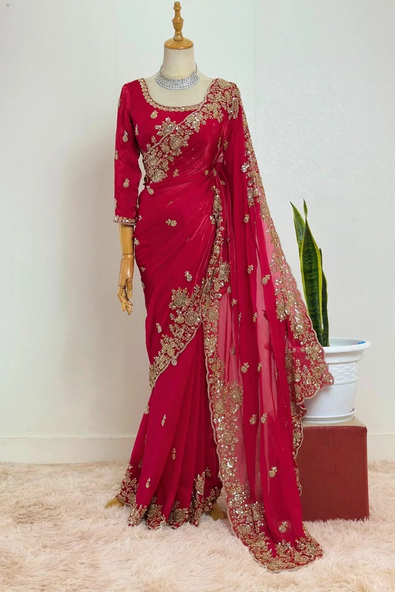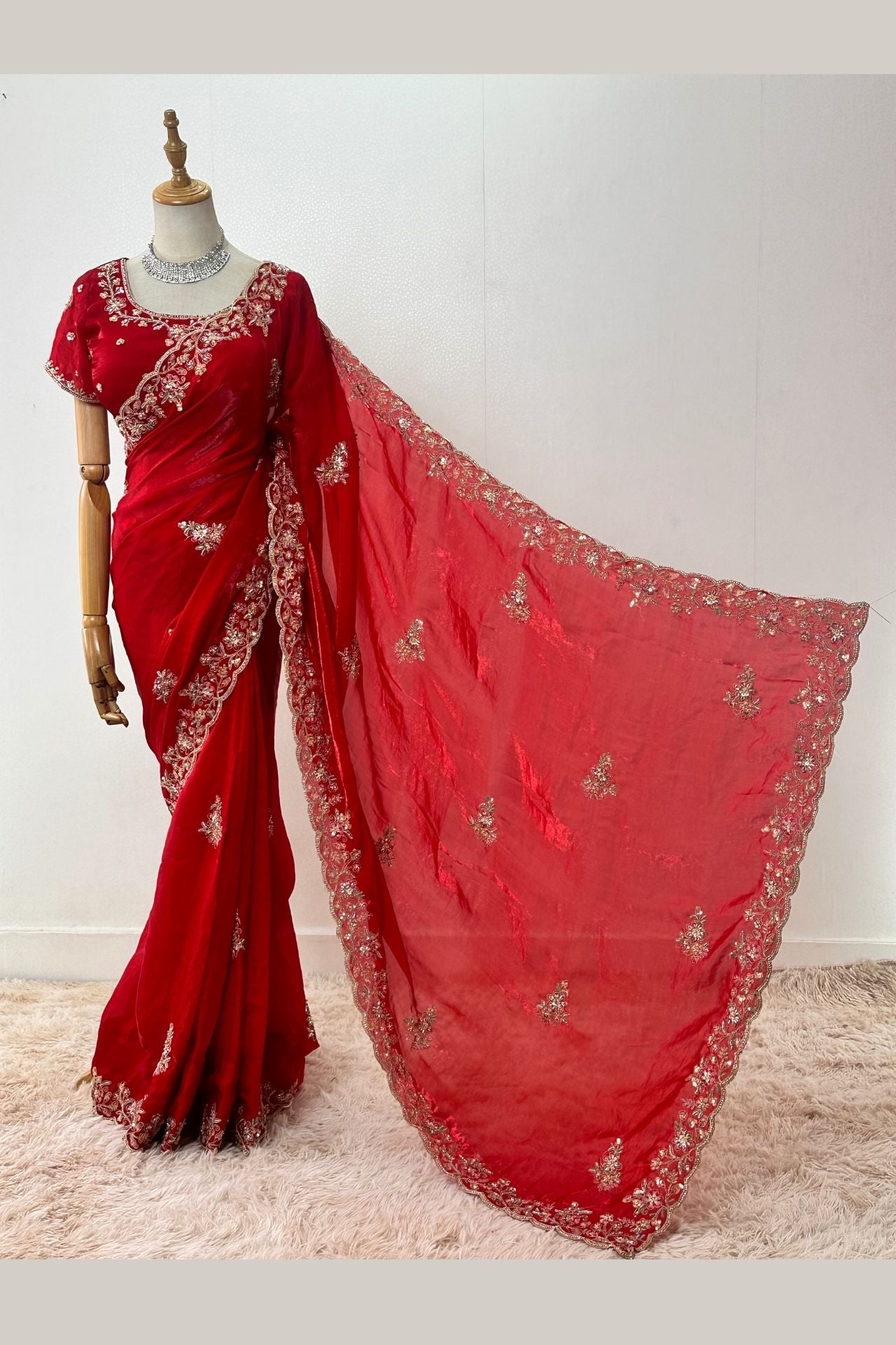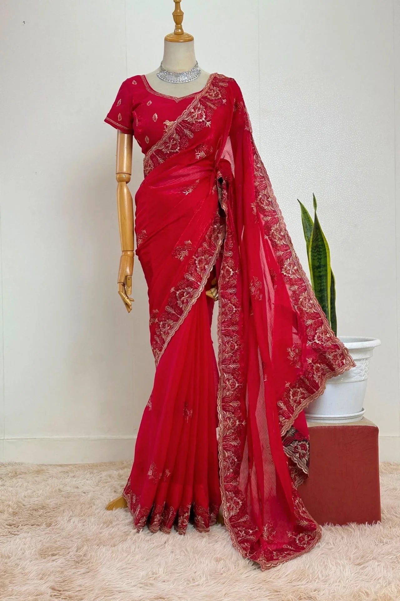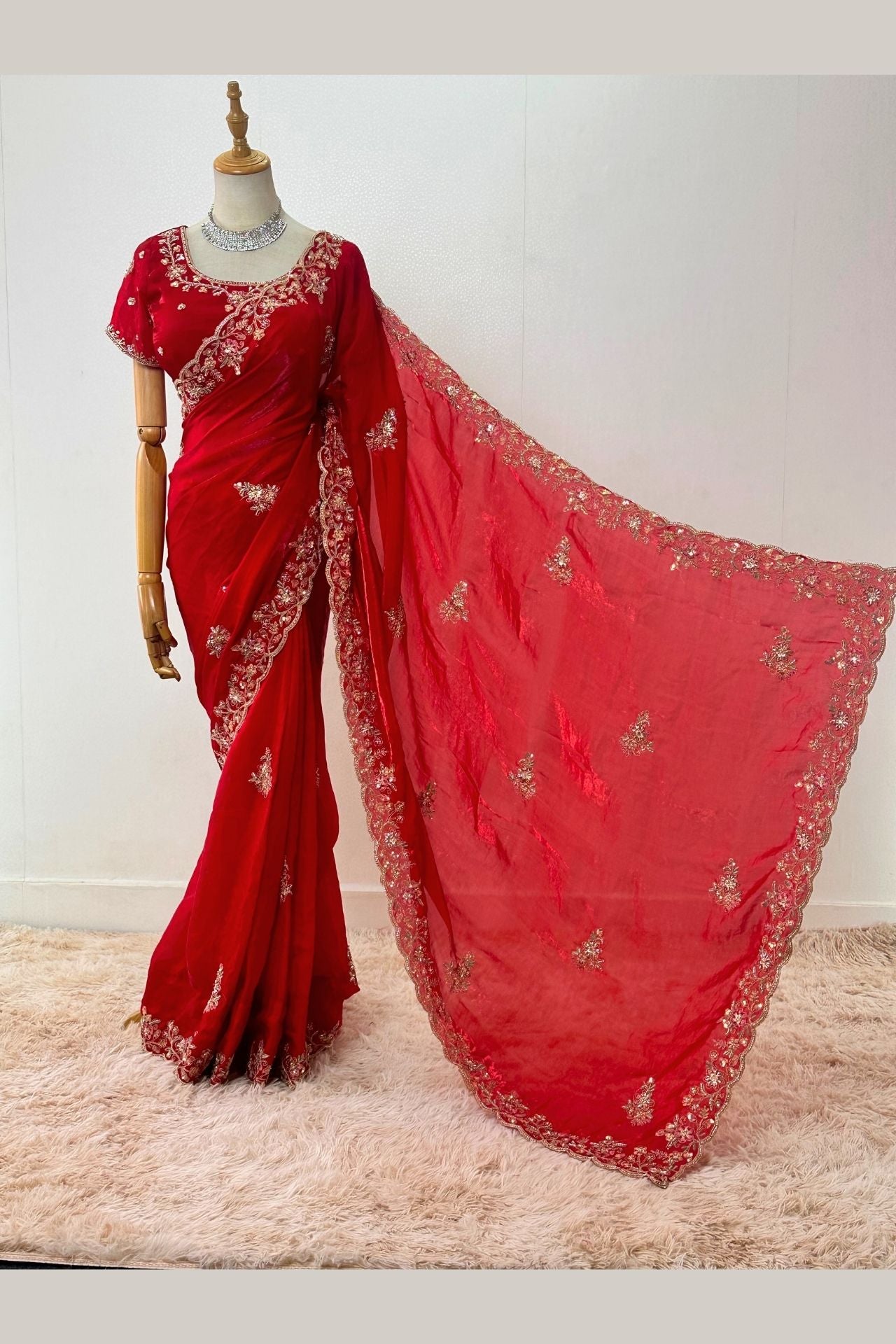 Red Georgette Saree with Intricate Zari and Sequin Work