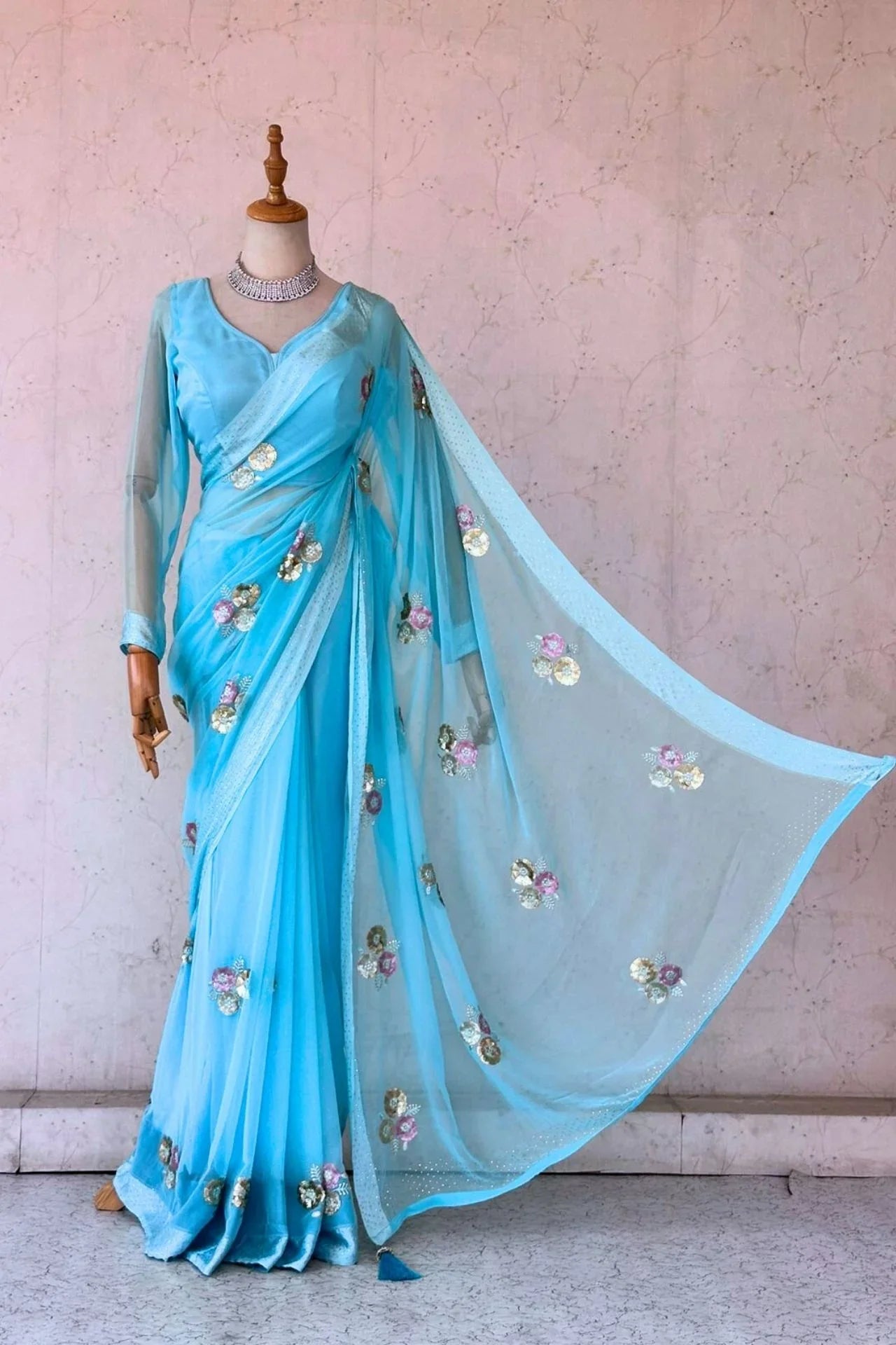 Embroidered Saree Set In Skyblue