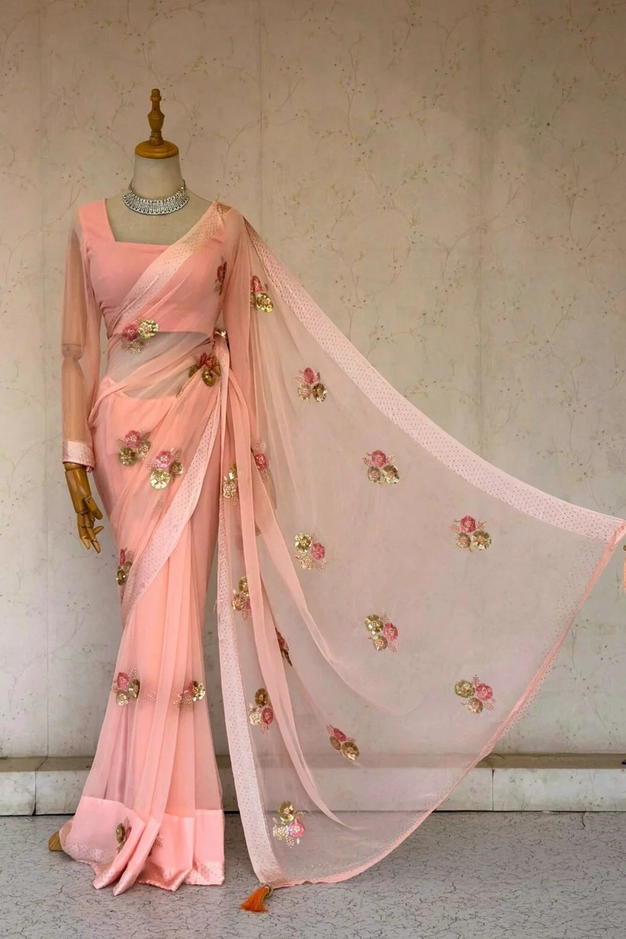 Peach Pink Floral Embroidered Saree