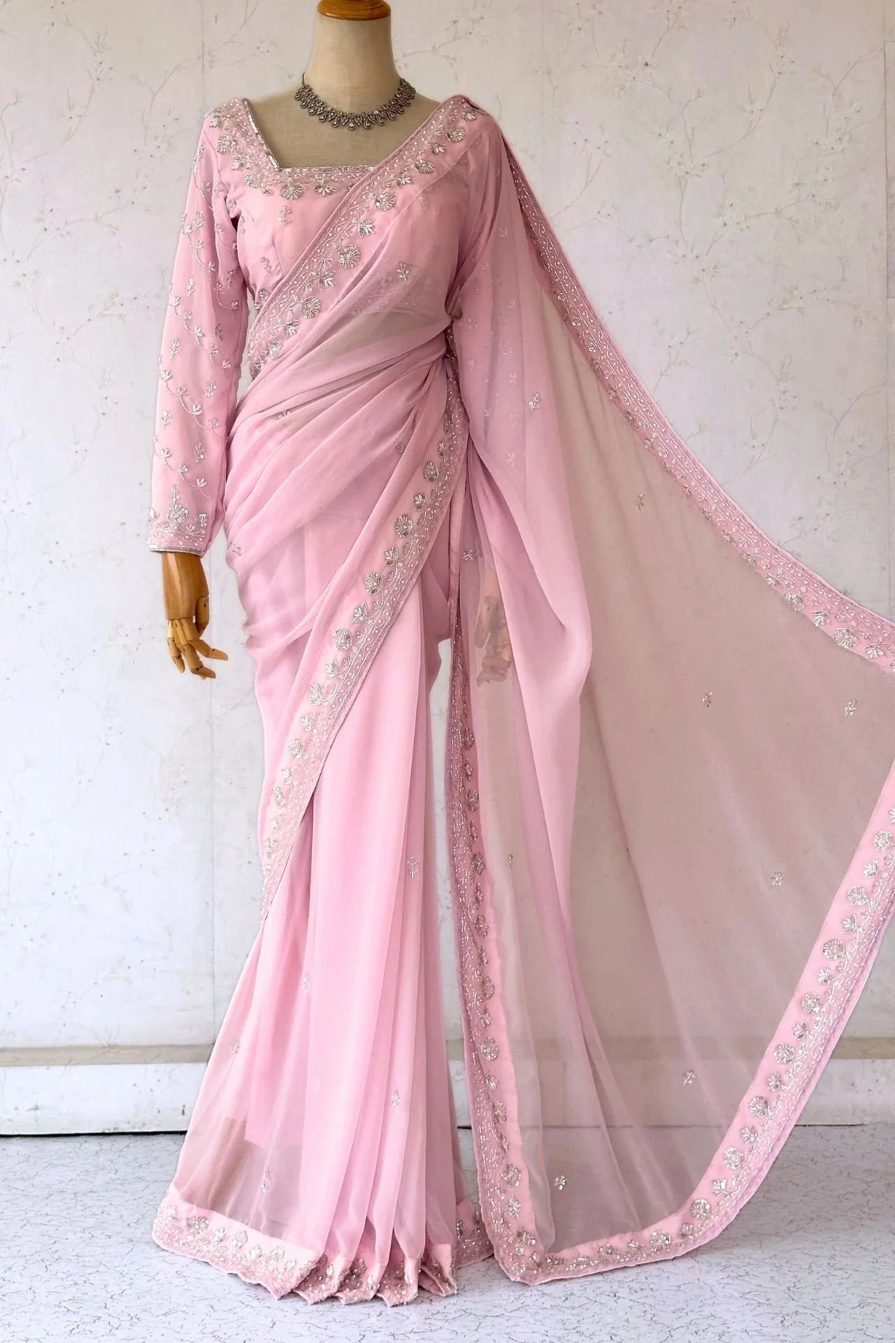 BabyPink Hand Embroidered Georgette Saree