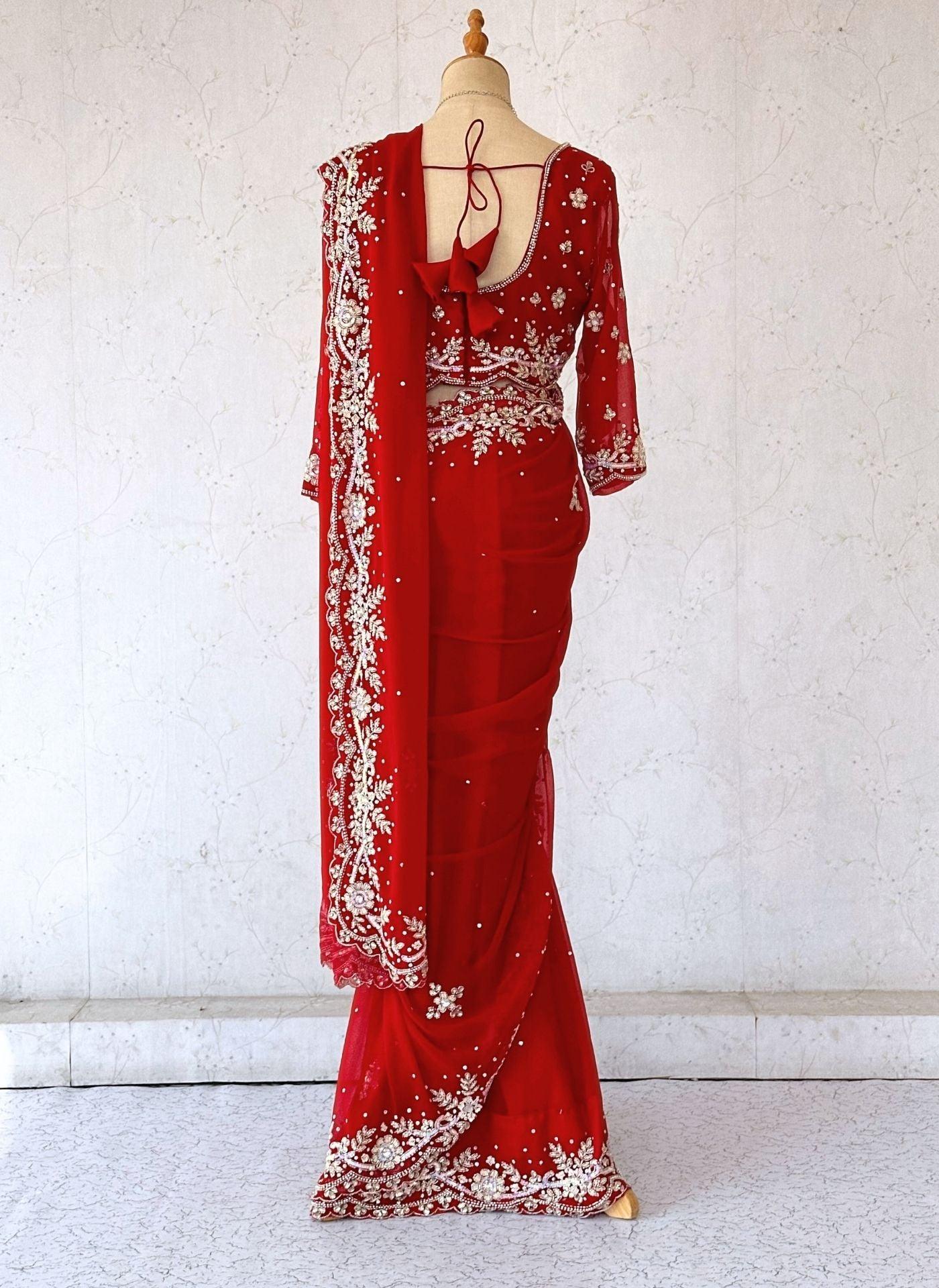 Red Floral Sequin Handwork Georgette Saree