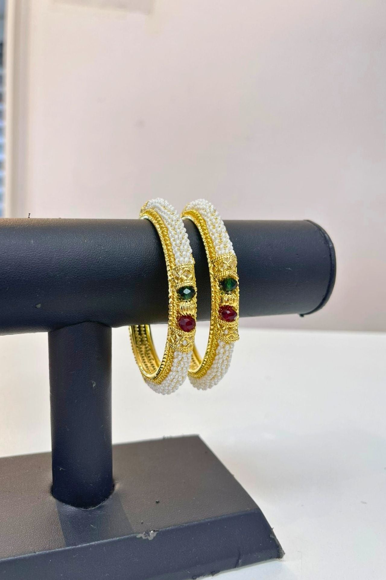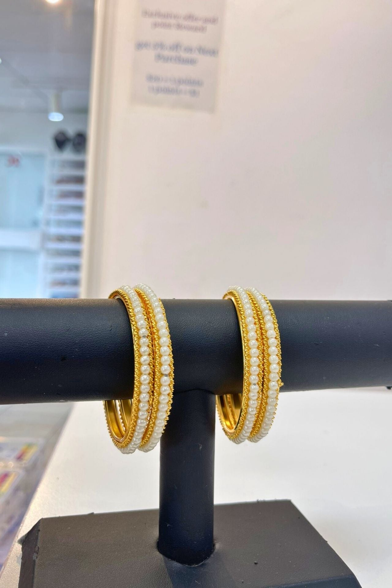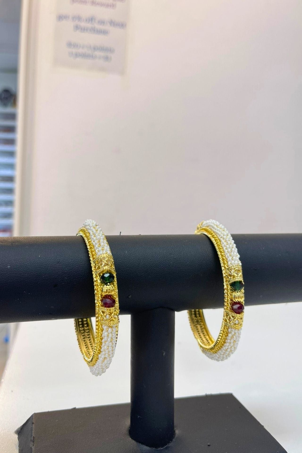 Gold Tone Bangle Set With Pearl Elephant Motif