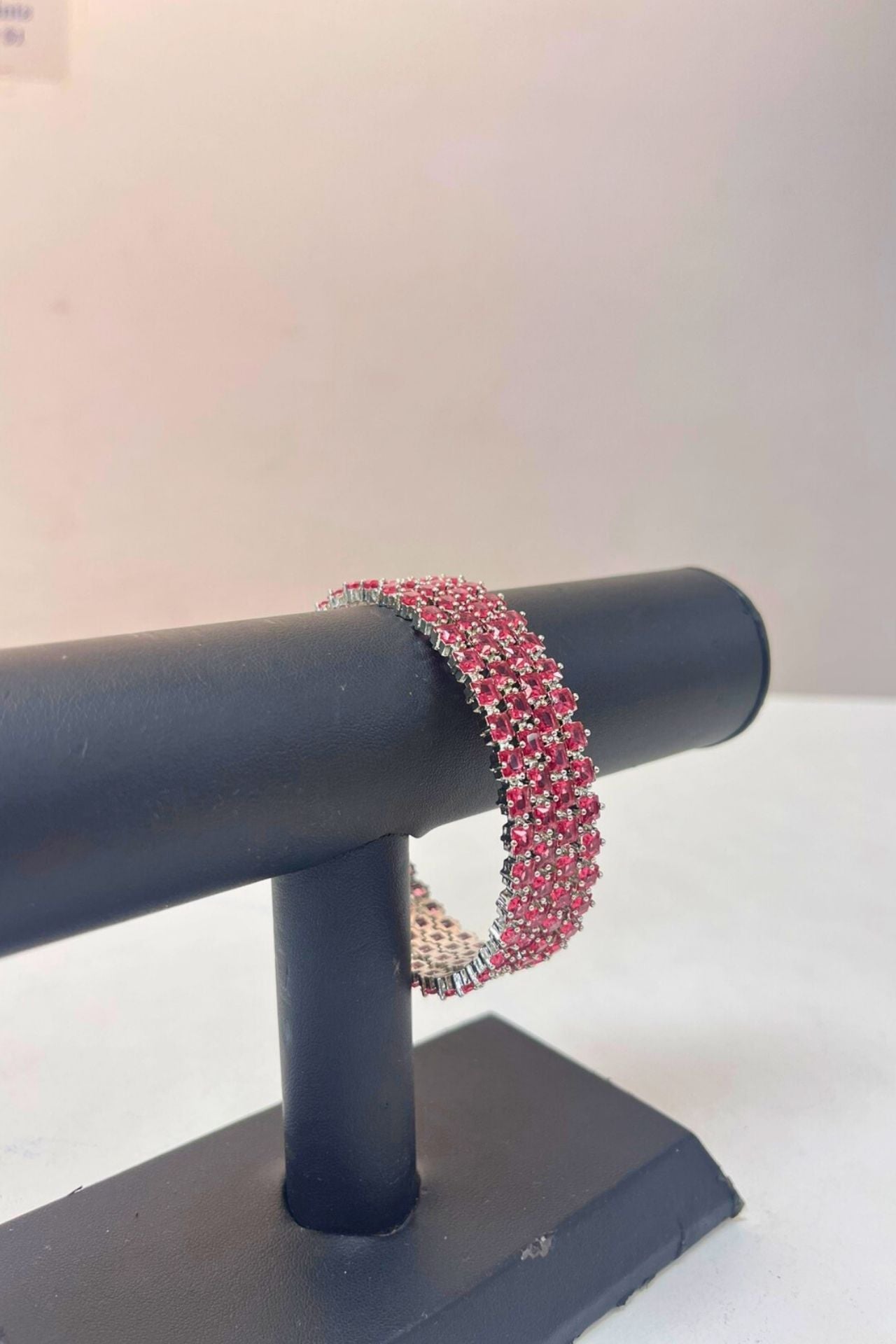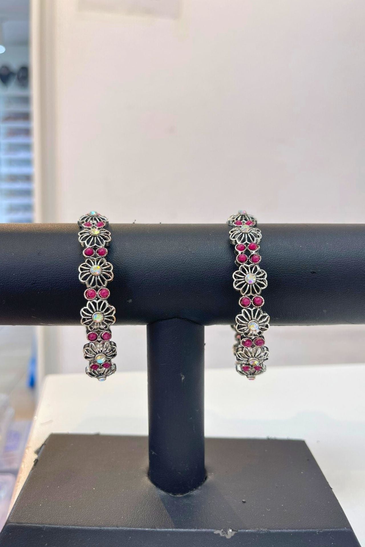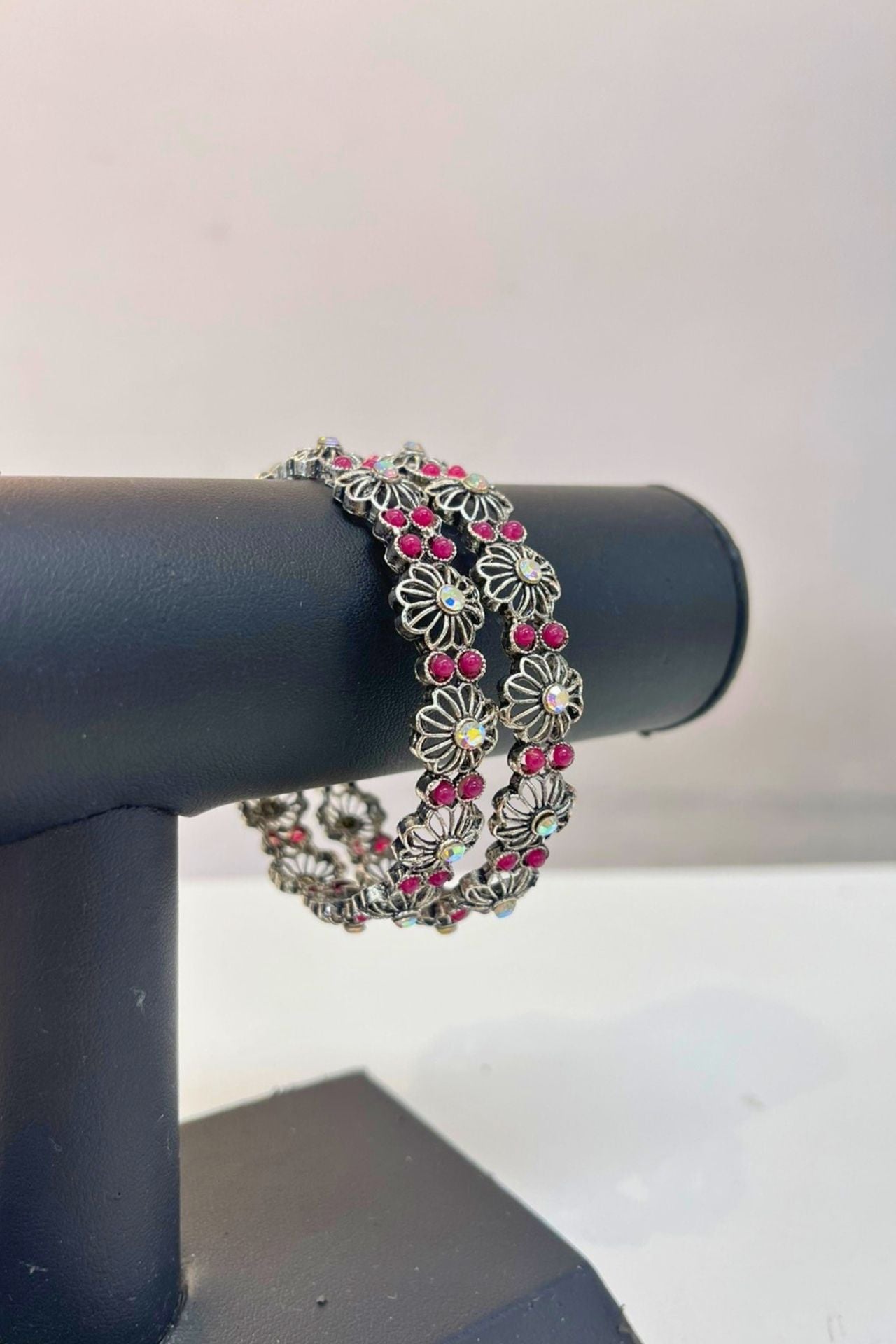 Silver Floral Bangle Set With Ruby Stone Oxidized