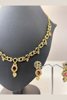 Design: A continuous pattern of gold-plated filigree loops and swirls, accented by small oval ruby-toned stones and a central teardrop dangle.