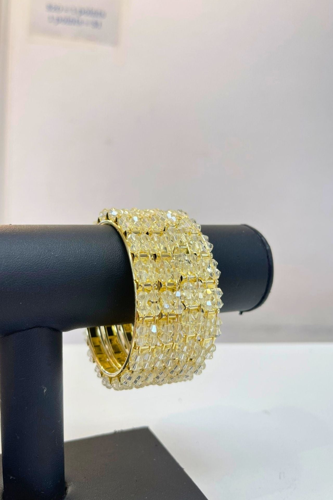 Design: Wide bangles densely covered with small, multi-faceted clear crystal beads.