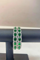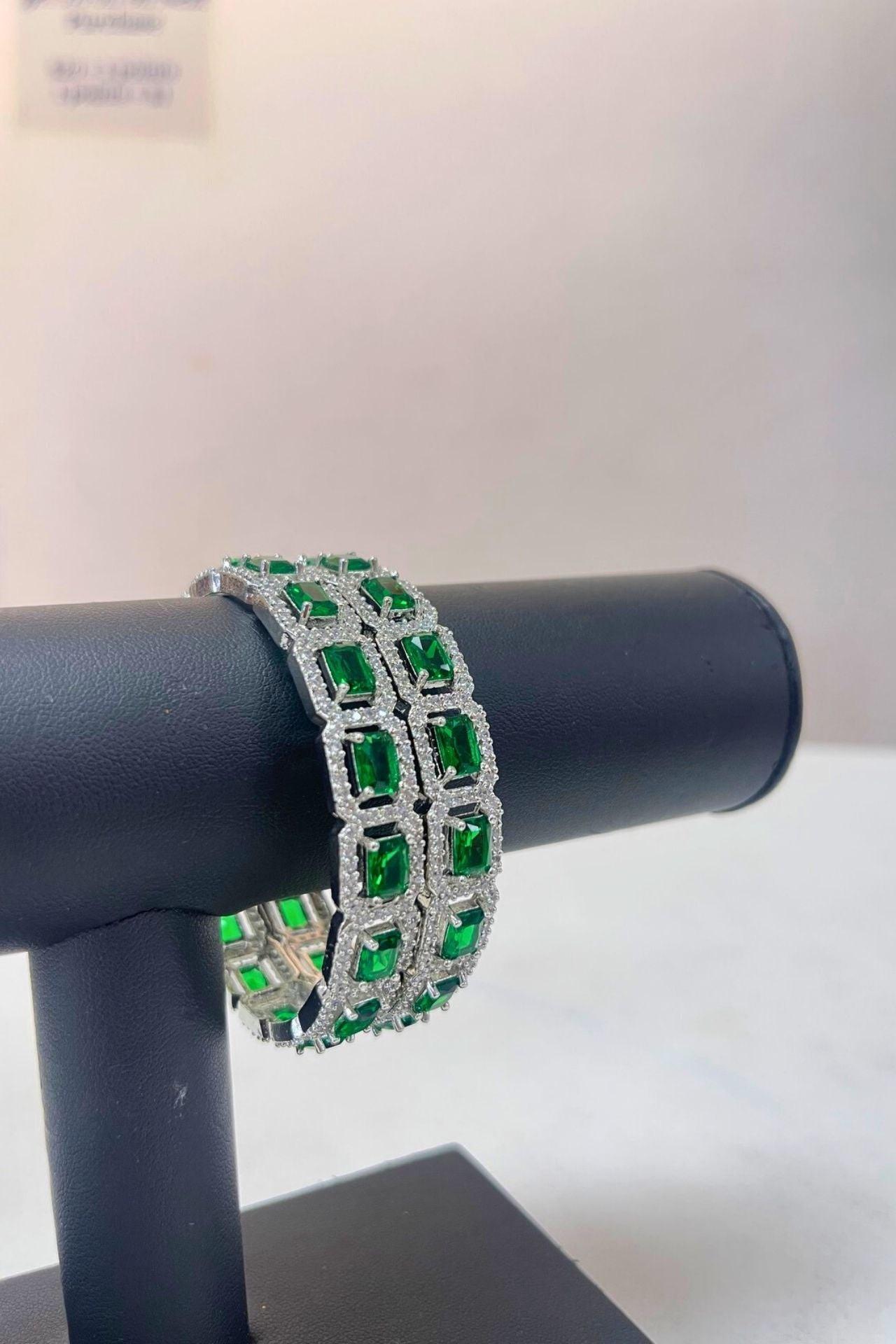 Design: A bold, broad design with continuous, interlinked rectangular motifs, each showcasing a prominent green CZ stone surrounded by a halo of micro-pave clear diamonds.