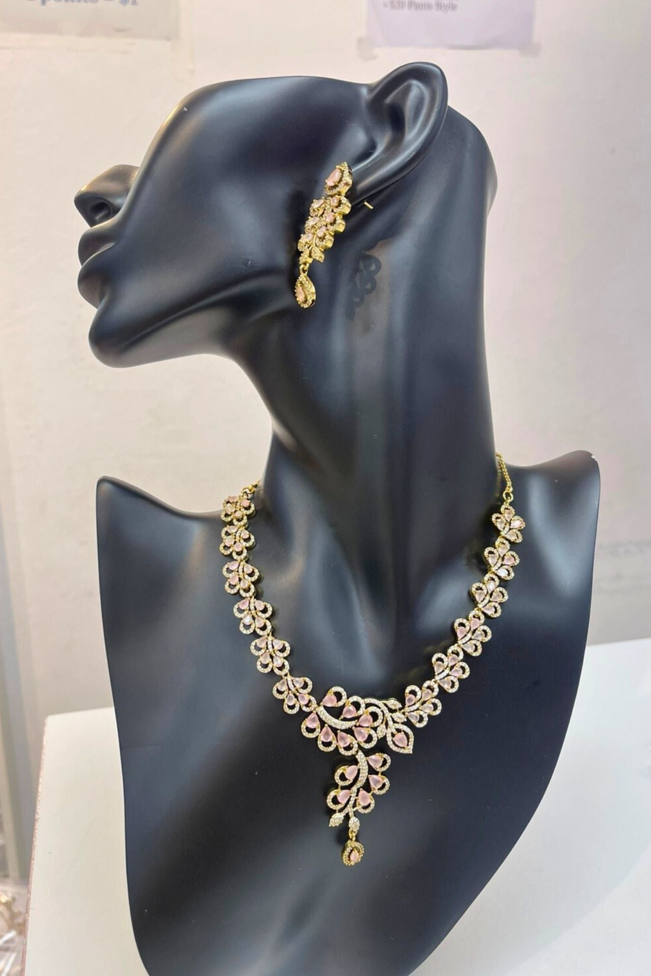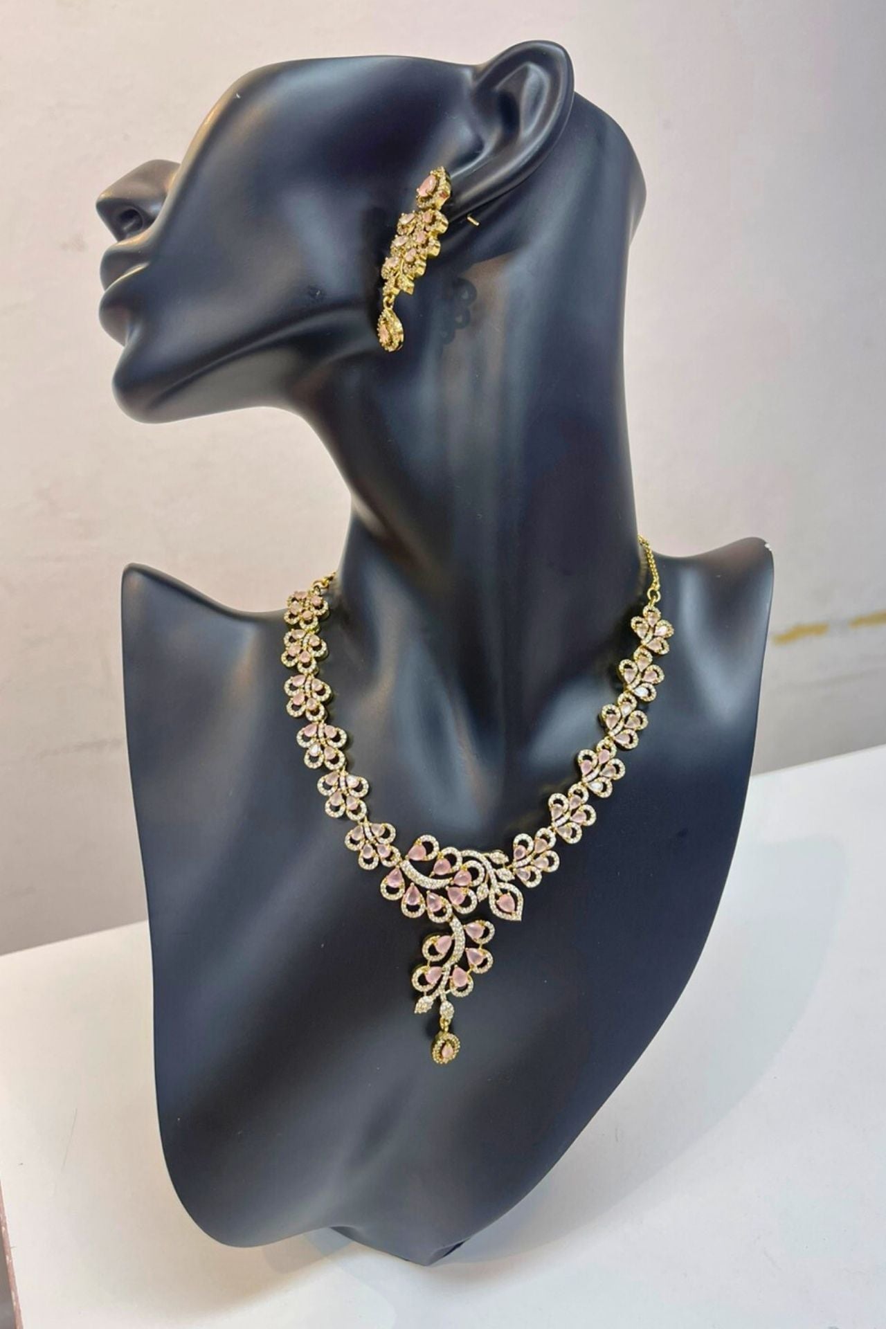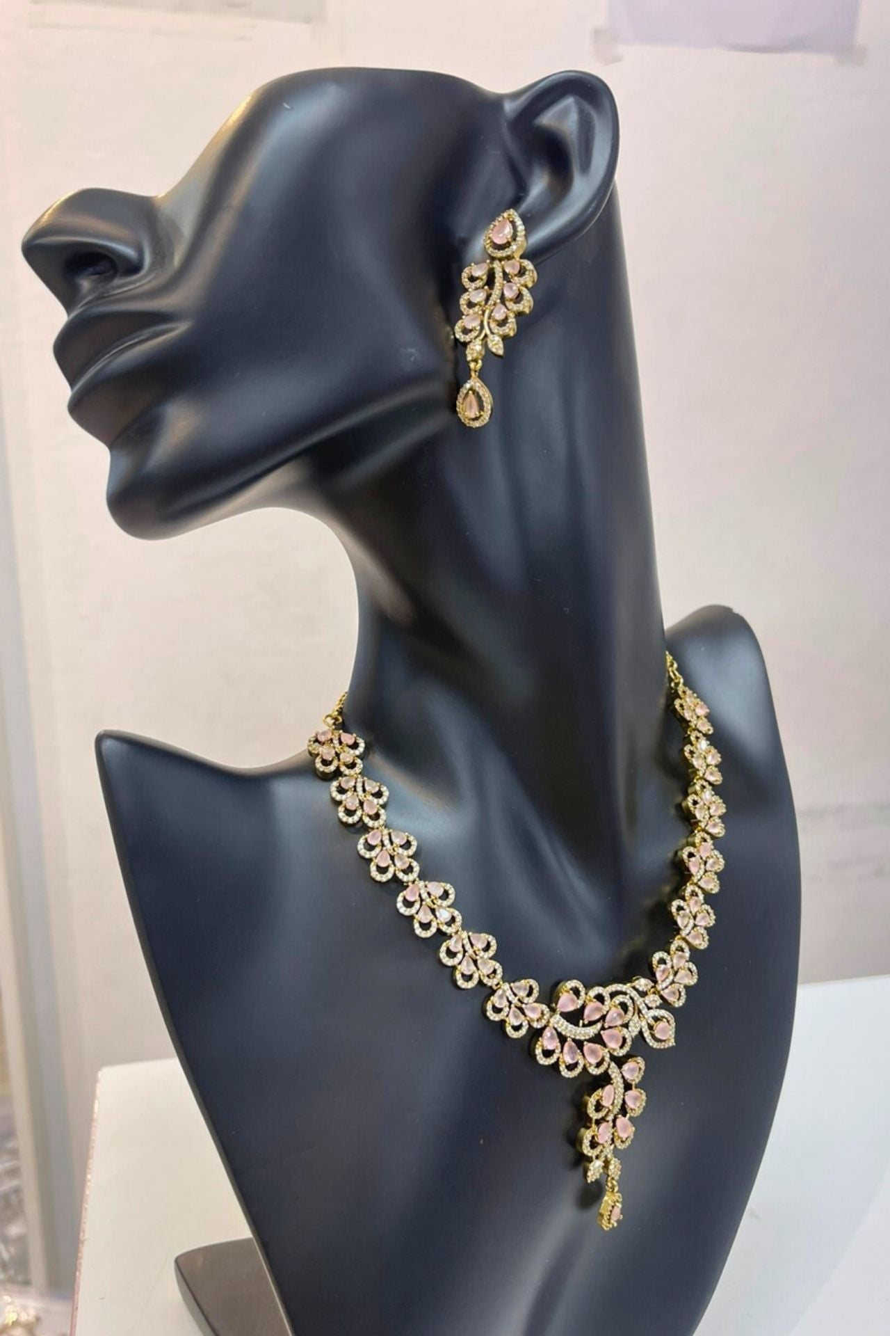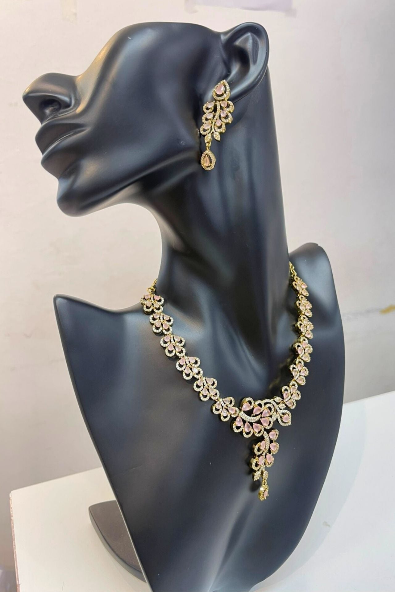 Blush Pink Petal American Diamond Gold Plated Necklace Set