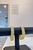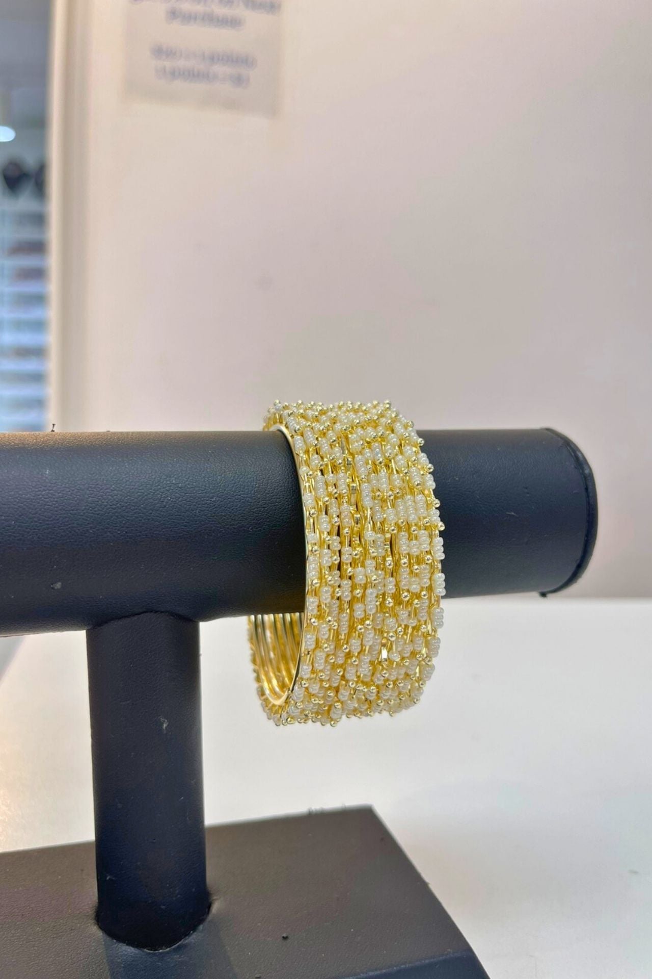 Design: Multiple thin bangles are densely wrapped or clustered with strands of small, round pearls, creating a thick, layered cuff appearance when worn together.