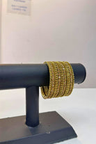 Design: A combination of thick bangles featuring clear/pink stone inlay, alternating with thinner, heavily beaded bangles.