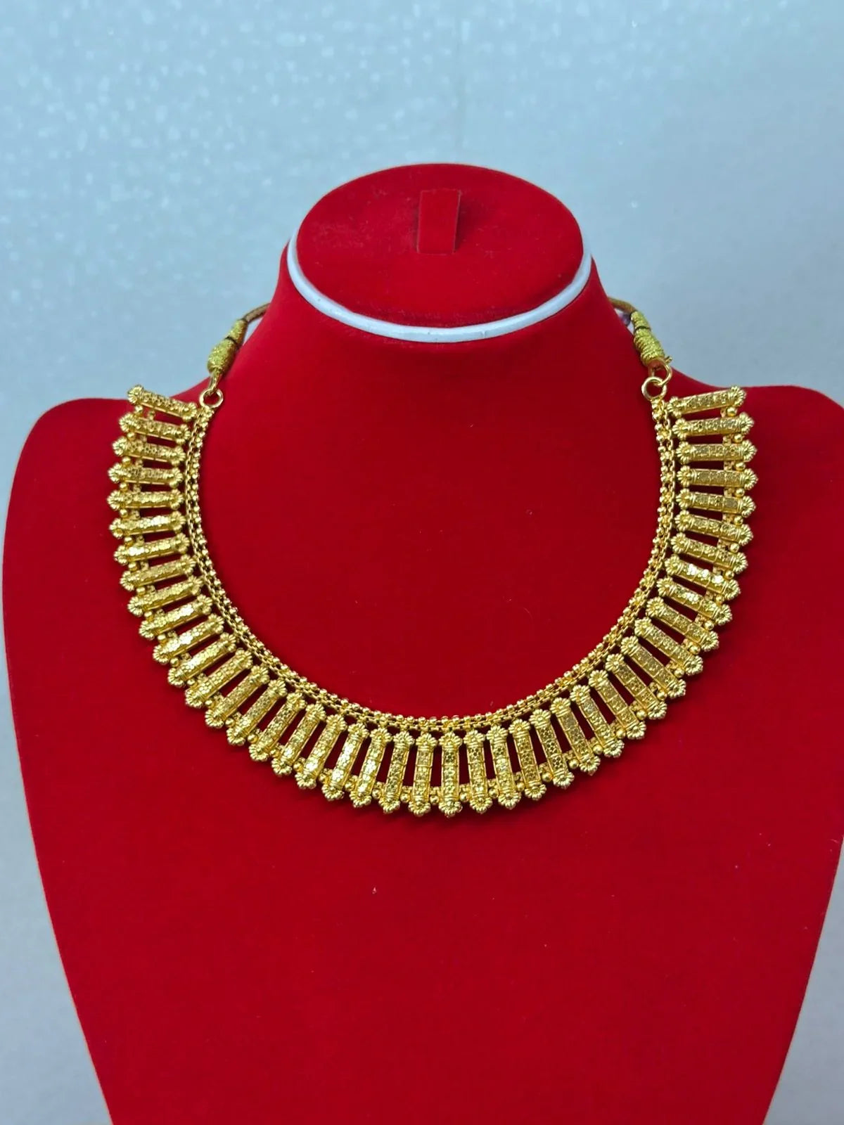 Design: This necklace features a broad, U-shaped band with a striking, uniform pattern. It is composed of multiple rows of small, granular beads and vertical, pillar-like segments with textured, ridged patterns.