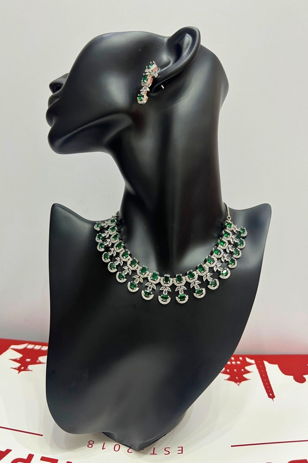 Color: Silver tone metal with vibrant Emerald Green and Clear American Diamonds (AD).