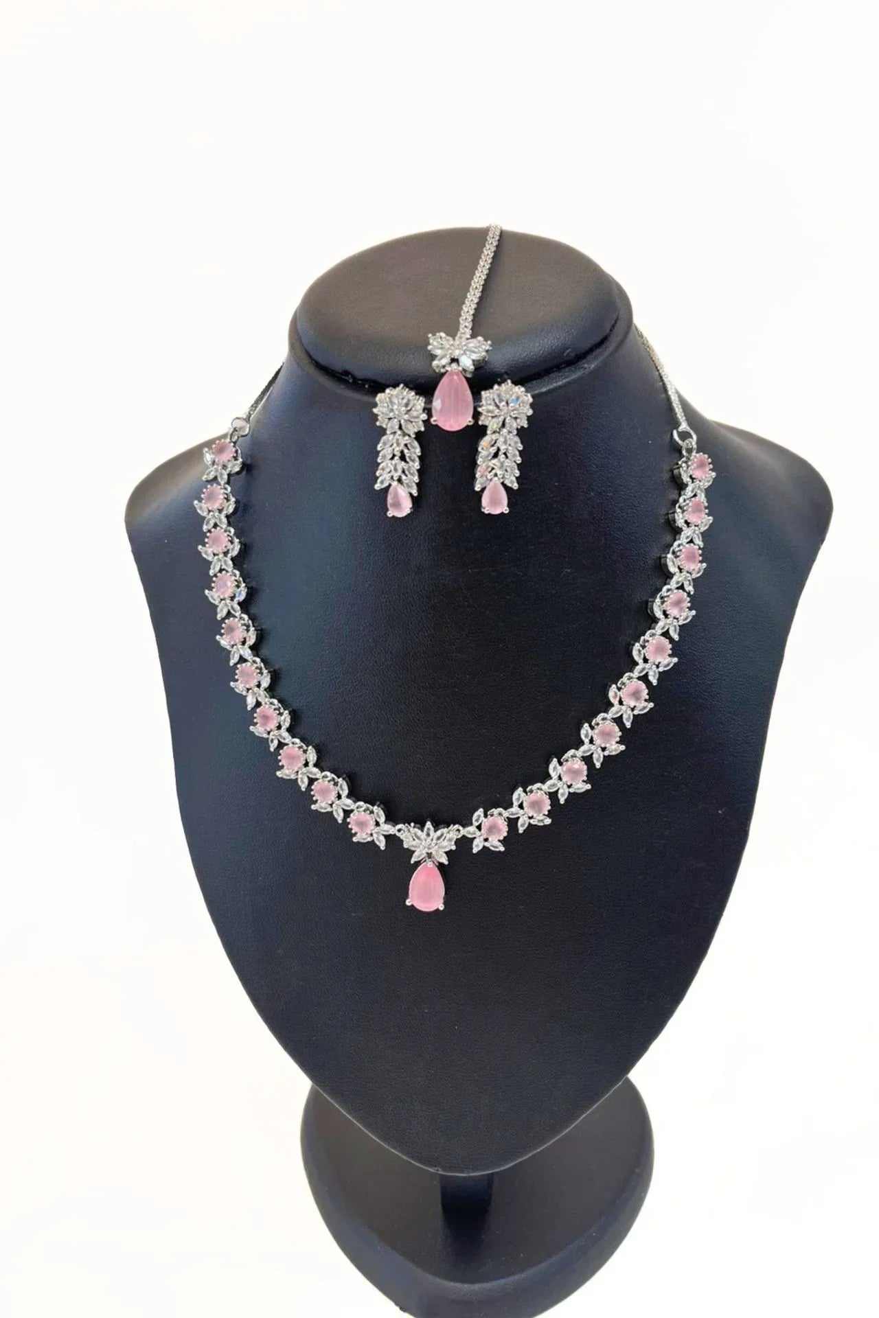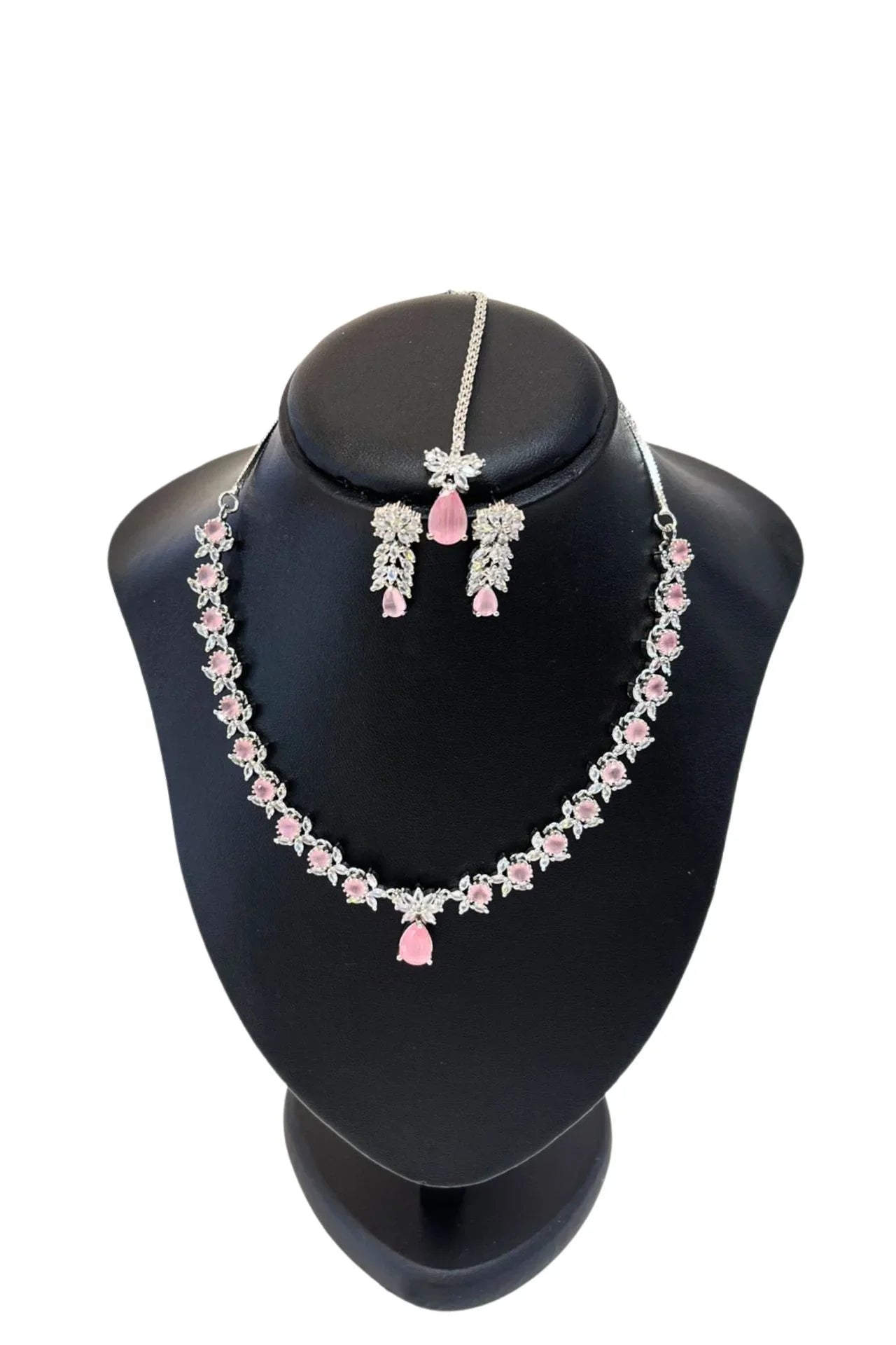 Pink & Silver Plated Necklace Set with Maang Tikka