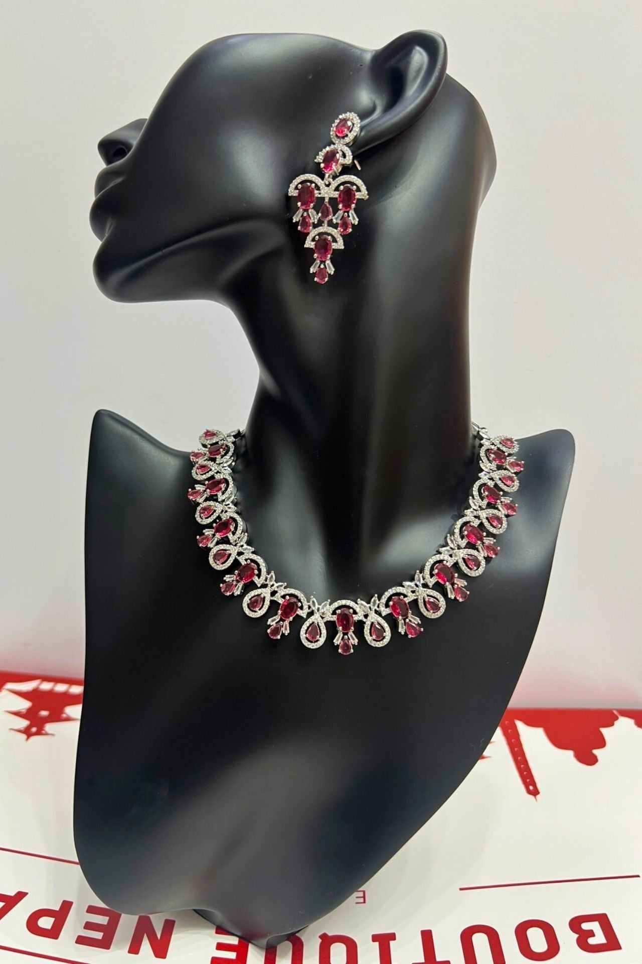 Design: Continuous symmetrical pattern of pear-shaped red stones clustered with white accent stones, creating a scalloped, flexible collar. The earrings mirror this dramatic, cascading cluster design.