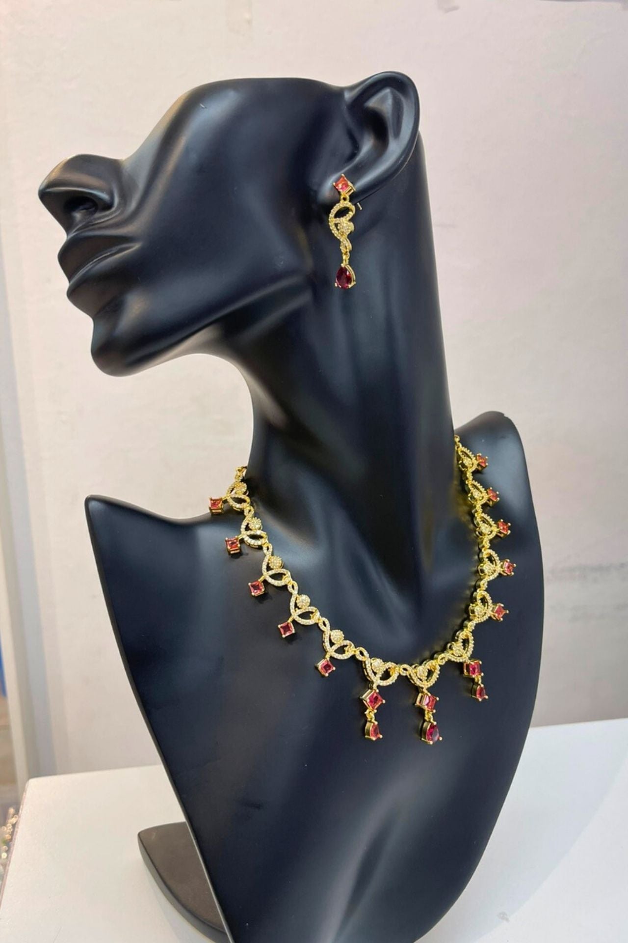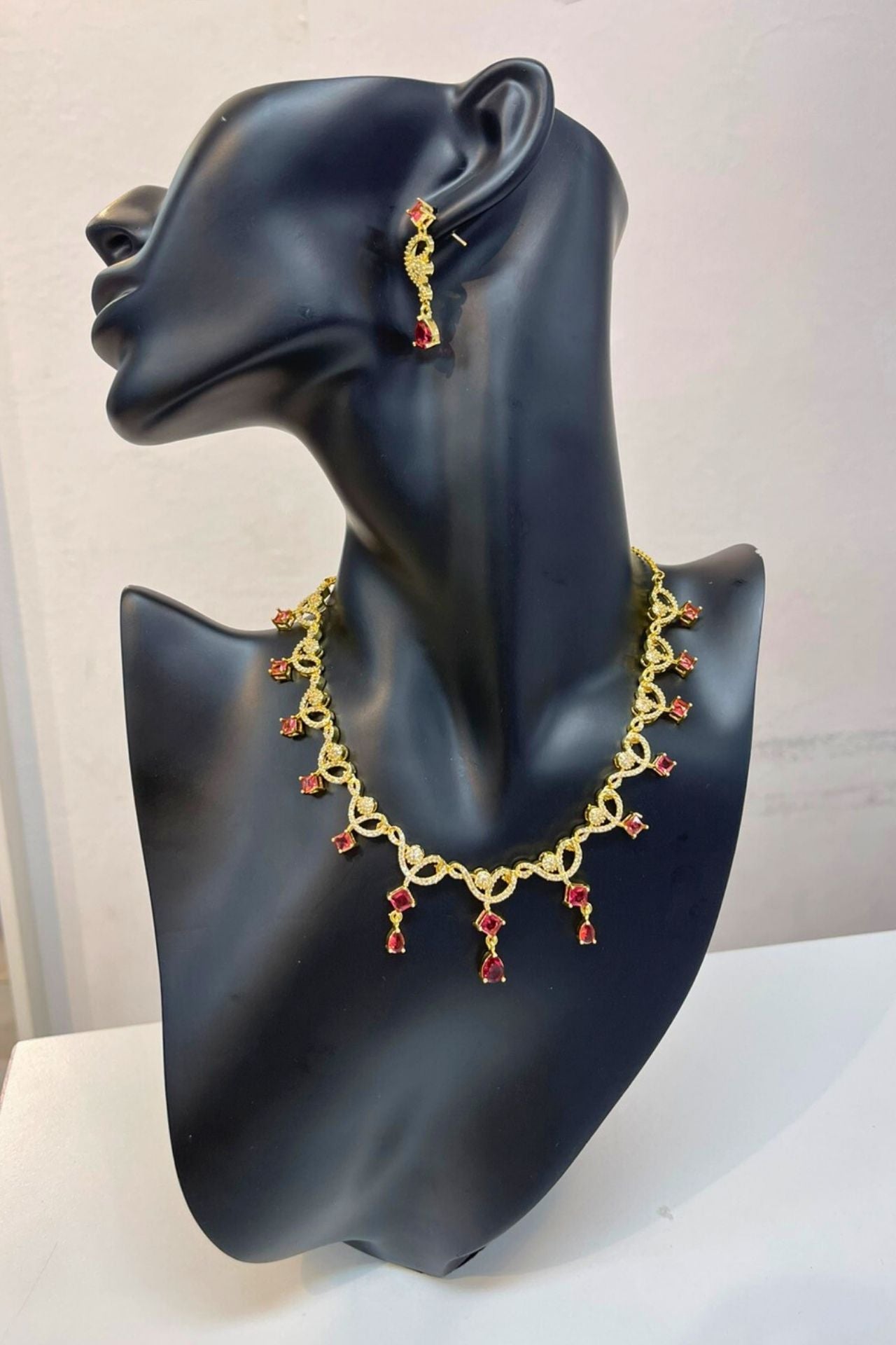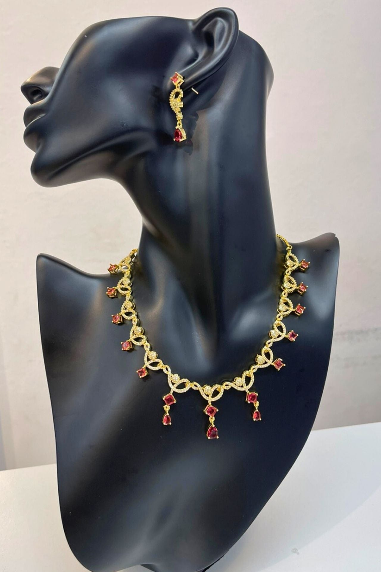 Ruby Red Dangle American Diamond Gold Plated Necklace Set