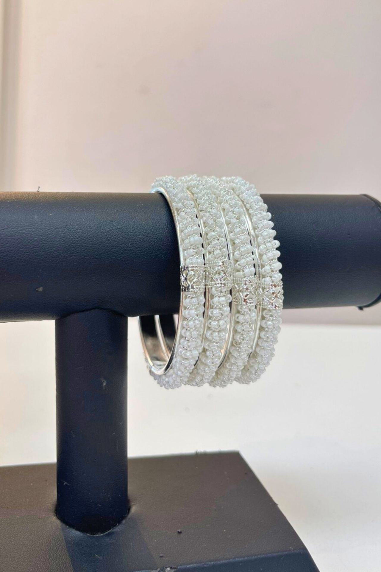 Design: Each bangle is beautifully wrapped with strands of tiny white pearls, featuring a central band with clear stone-like detailing for added sparkle.