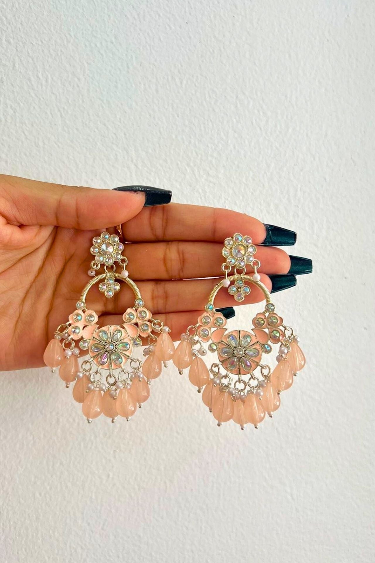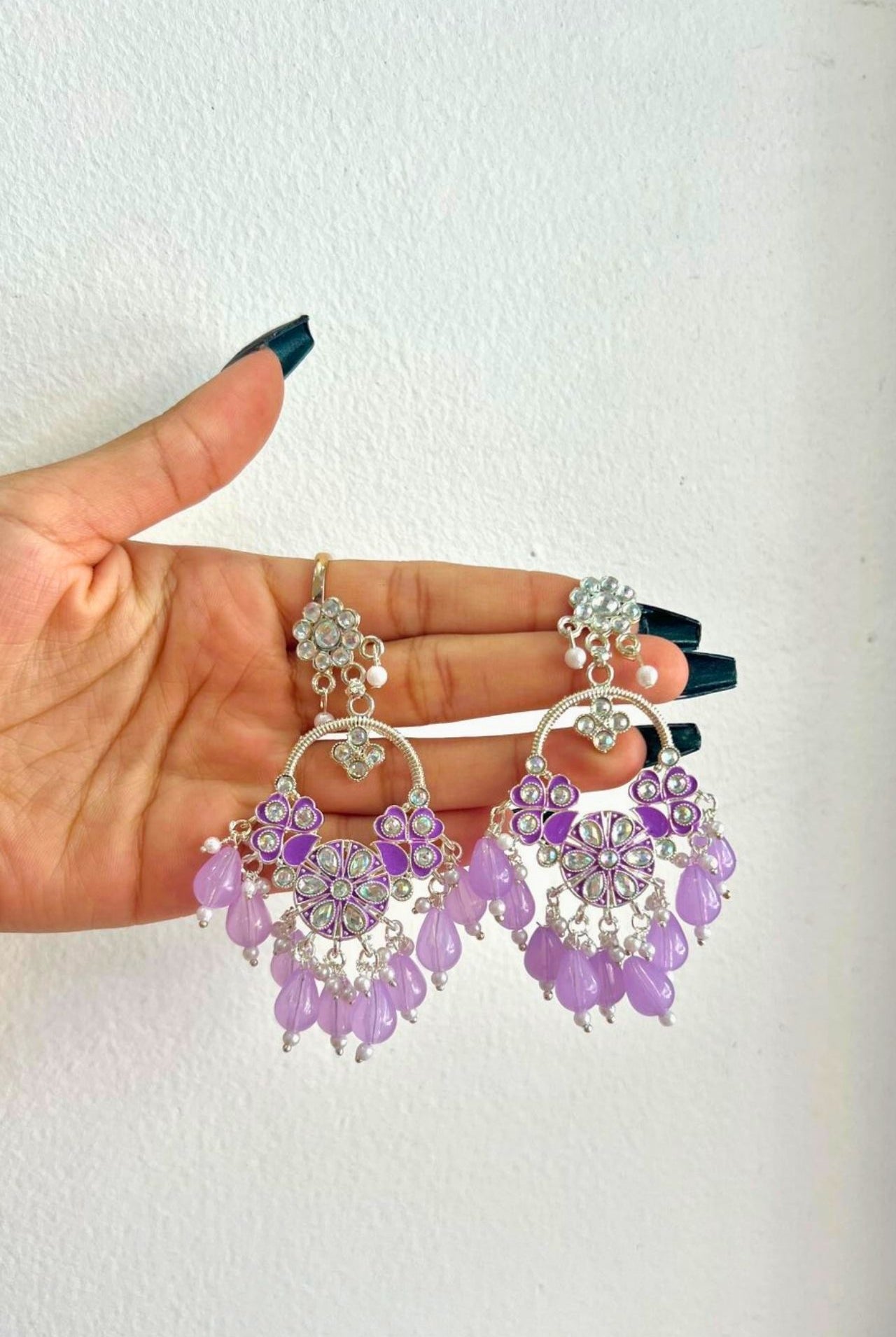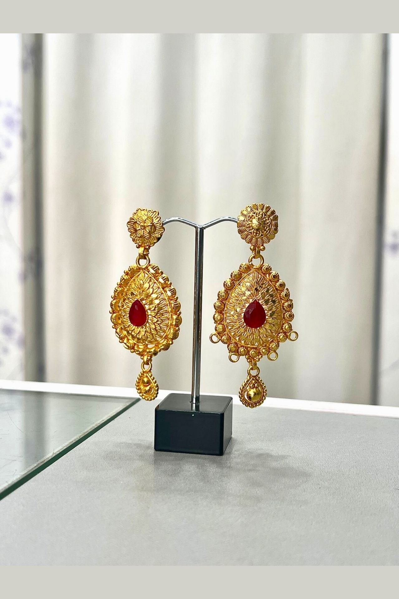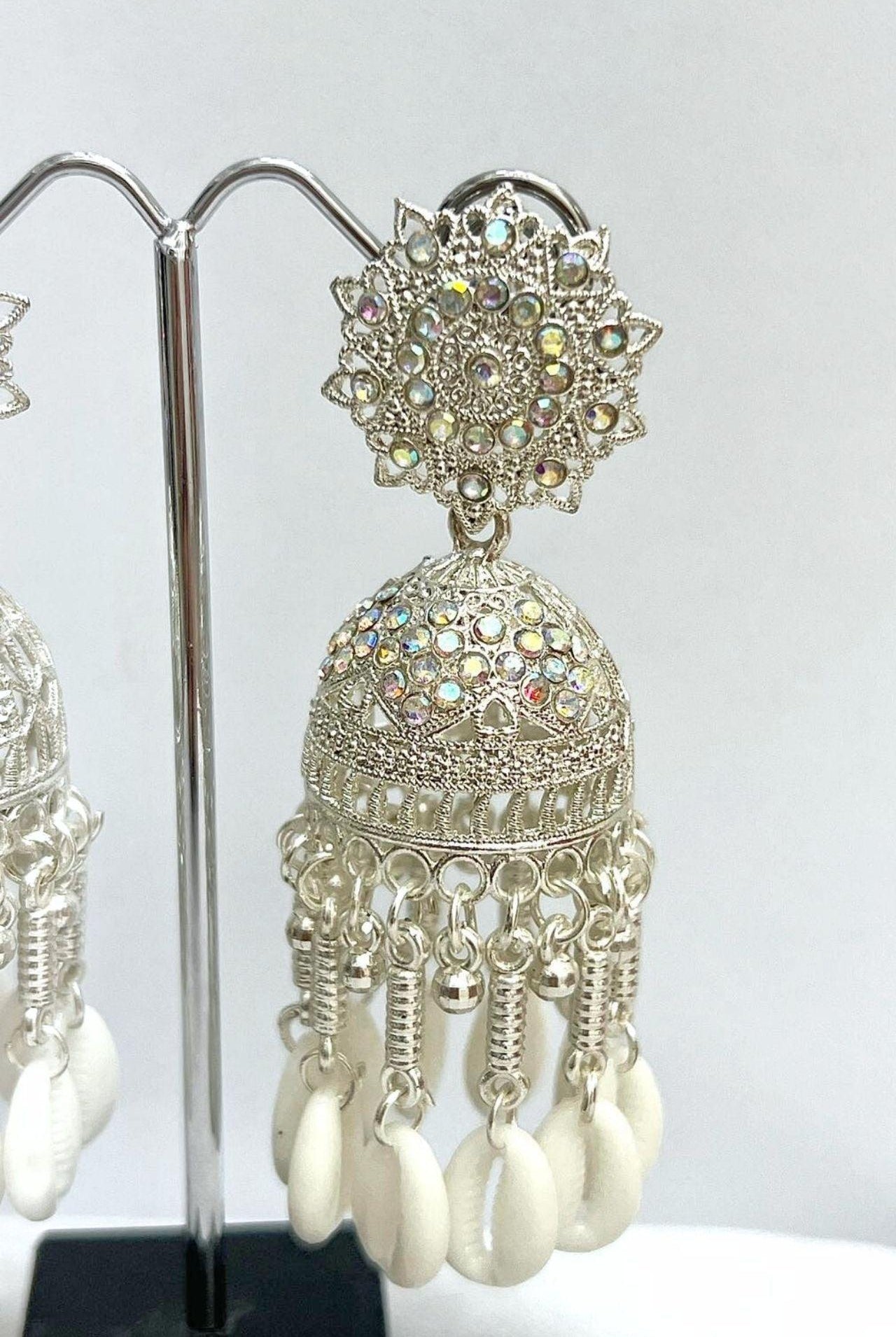 Jhumka is a style of earrings worn by women of the Indian subcontinent. It is a type of dangling earring with a pendant or tassel at the bottom. Jhumka is traditionally made from gold, silver, or brass and worn in pairs. They are often decorated with gemstones and pearls.