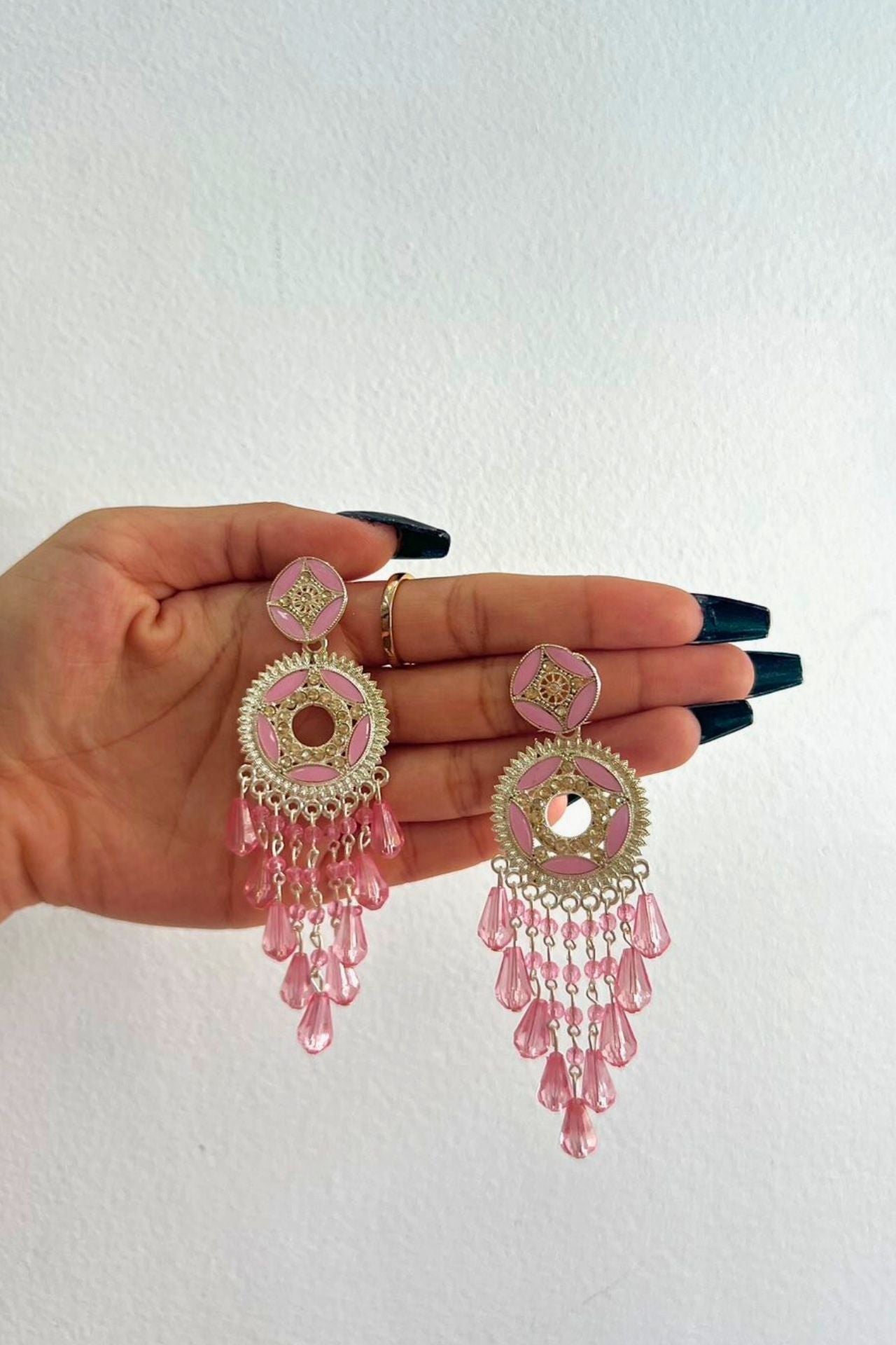 Design: Large circular chandelier design with pink Meenakari detailing, filigree work, and a heavy fringe of translucent pink teardrop beads.