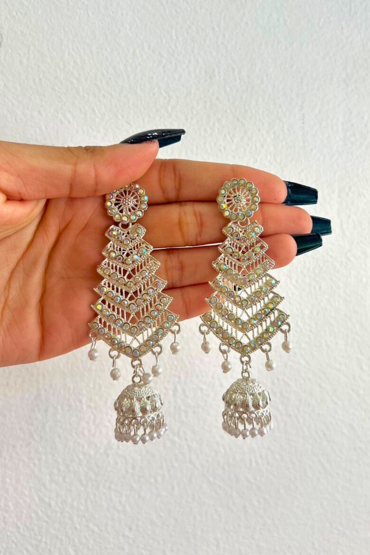Jhumka Earrings With Silver Tiered Kundan Style