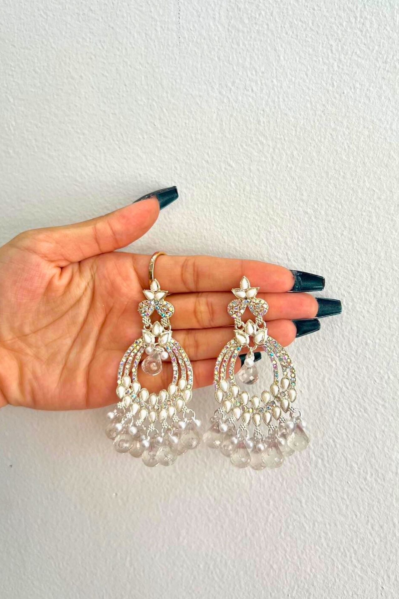 Design: Elaborate Chaandbali style featuring a floral stud, intricate pearl and Kundan settings, and a heavy fringe of clear, glass-like teardrop beads.