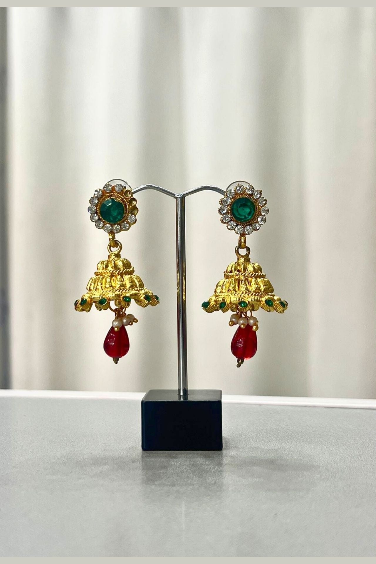 Design: Floral stud with a green stone center, connecting to a classic textured bell jhumka accented with small green stones and a single prominent red tear drop bead.