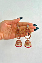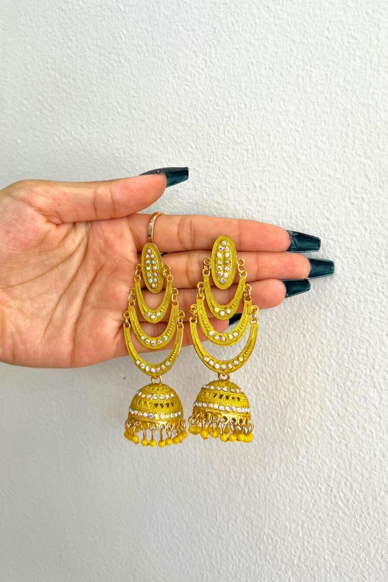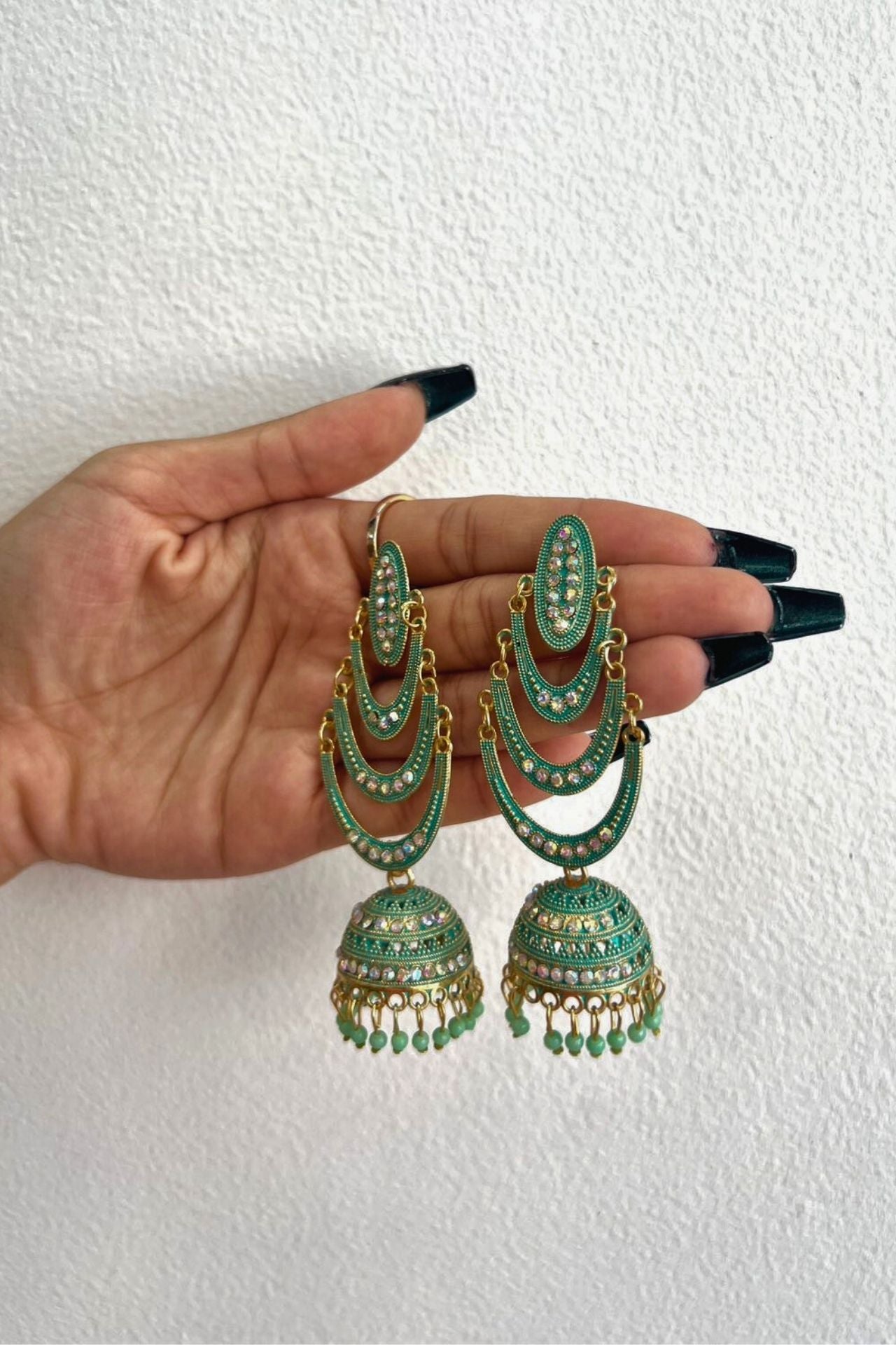Design: Tiered chandelier style featuring Meenakari on the Jhumka bell and cascading elements, finished with subtle stones.