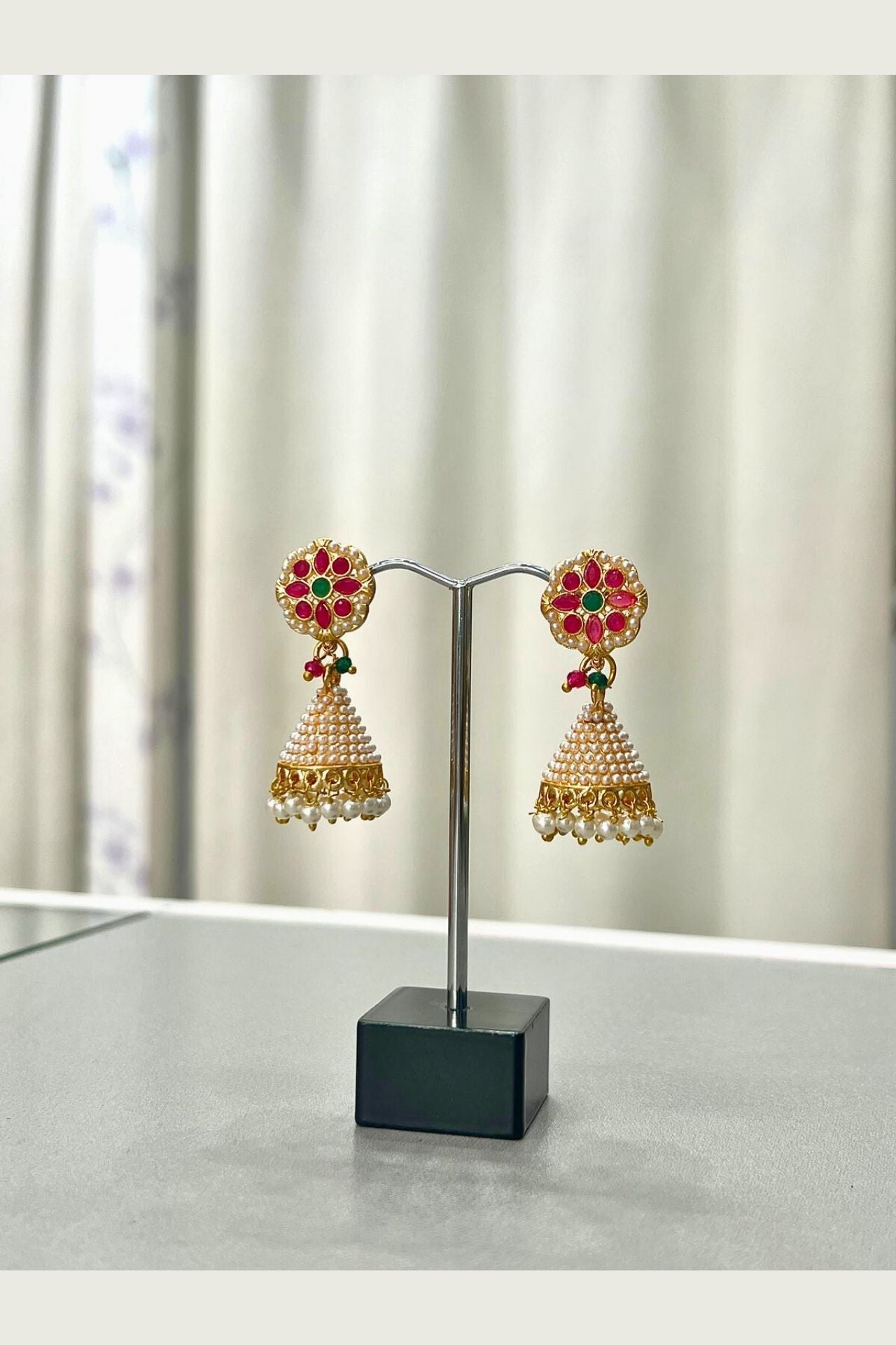Jhumka Earrings With Gold Ruby Pearl Accent