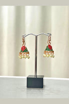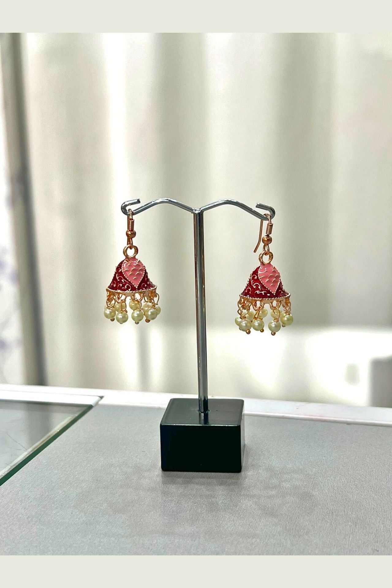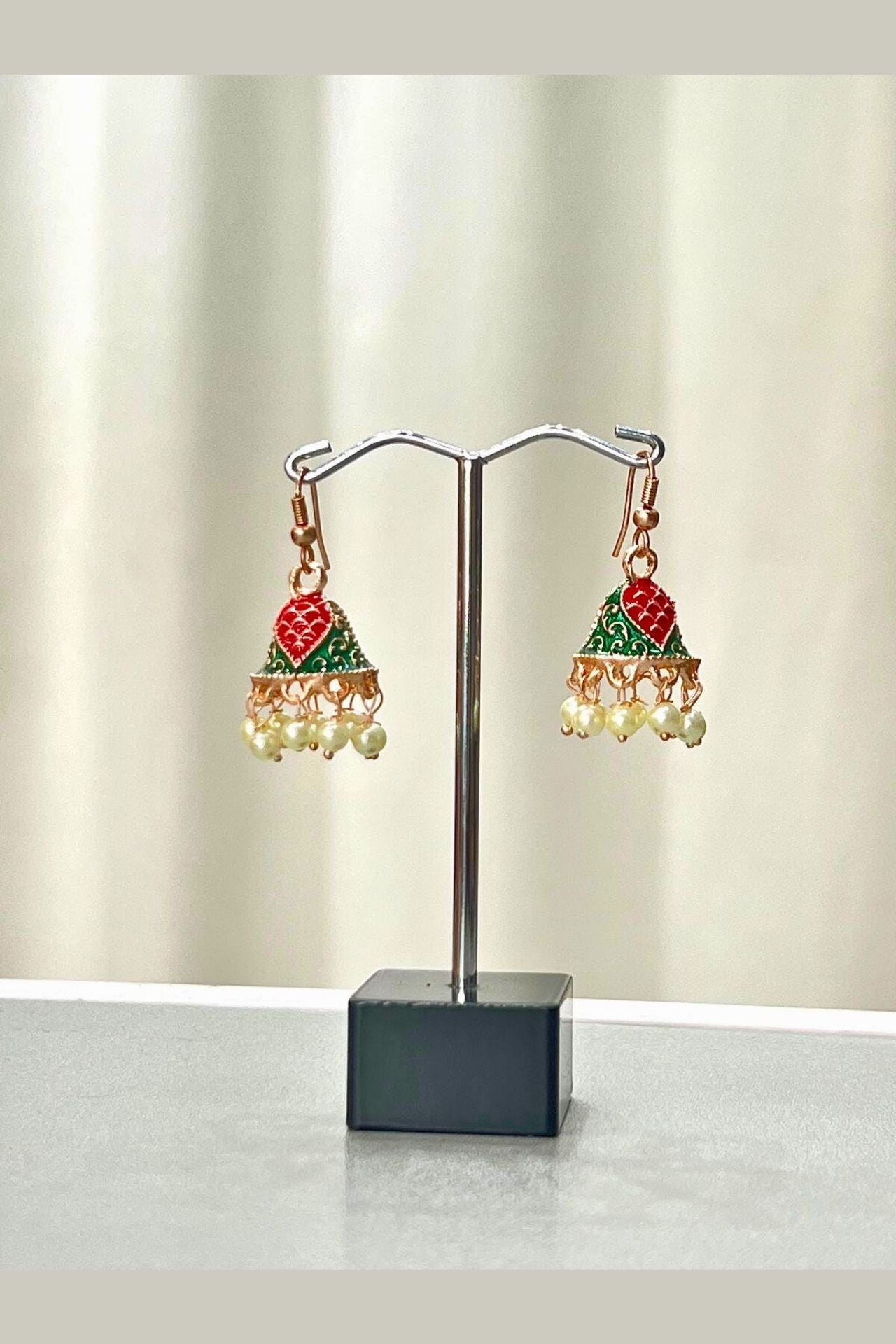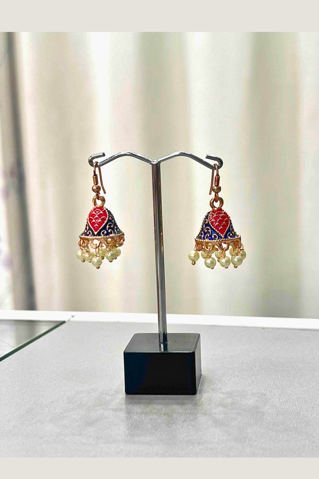 - Design: Small bell-shaped jhumki with a vibrant Meenakari heart motif, suspended from a hook and finished with a cluster of mini pearl drops.