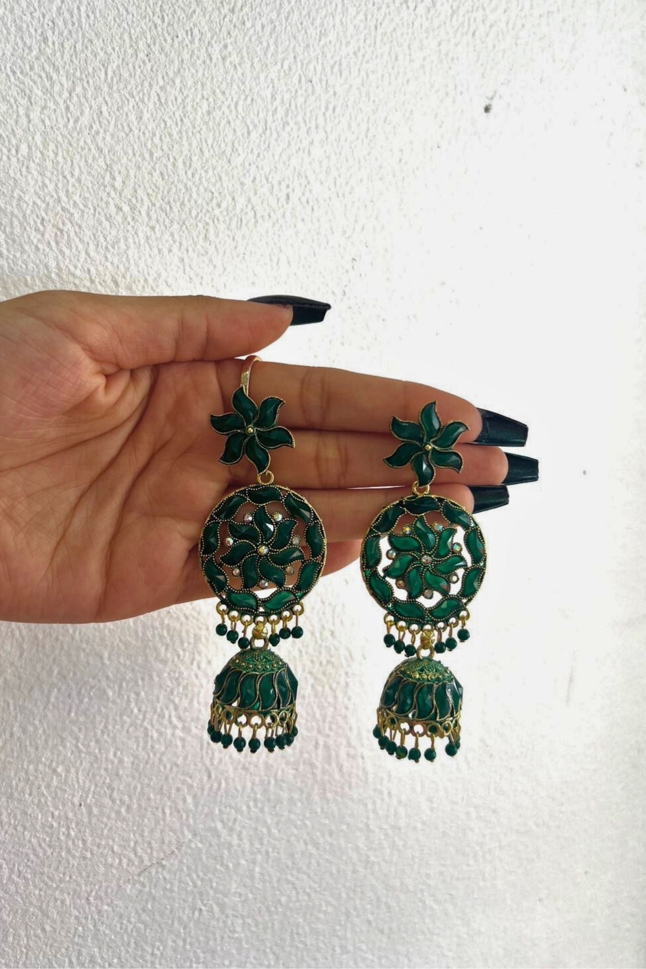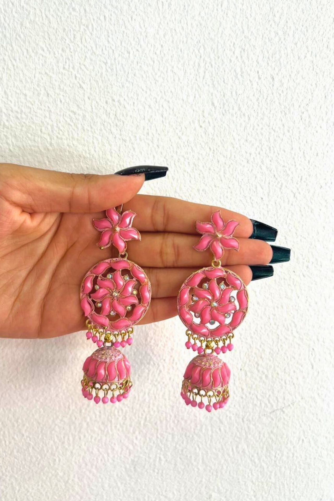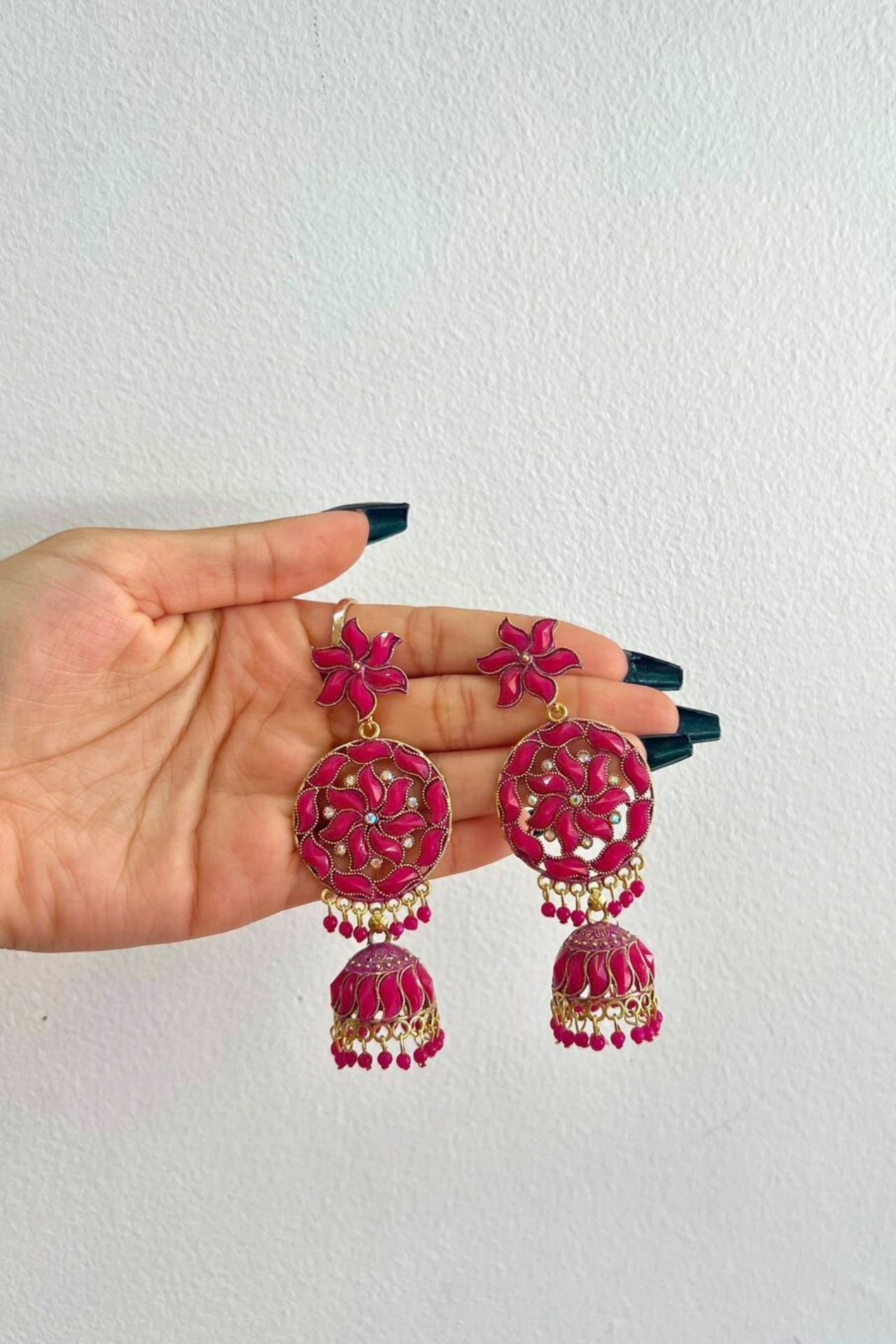 Design: Dangling Jhumka style featuring a floral stud, an open-work wheel centerpiece, and a bell, all richly coated in Meenakari.