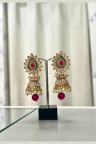 Design: Ornate floral stud transitions into a pearl-heavy jhumka dome, accented by a single large, vibrant pink teardrop bead.