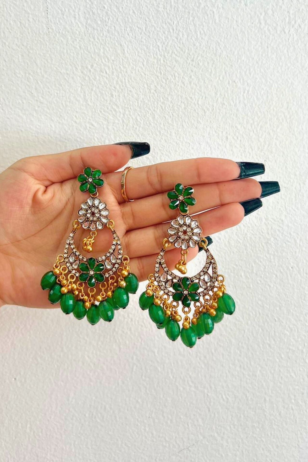 Design: Traditional Chaandbali (crescent moon) shape with a floral stud, Kundan stone settings, green enamel work, and a heavy fringe of green teardrop beads.