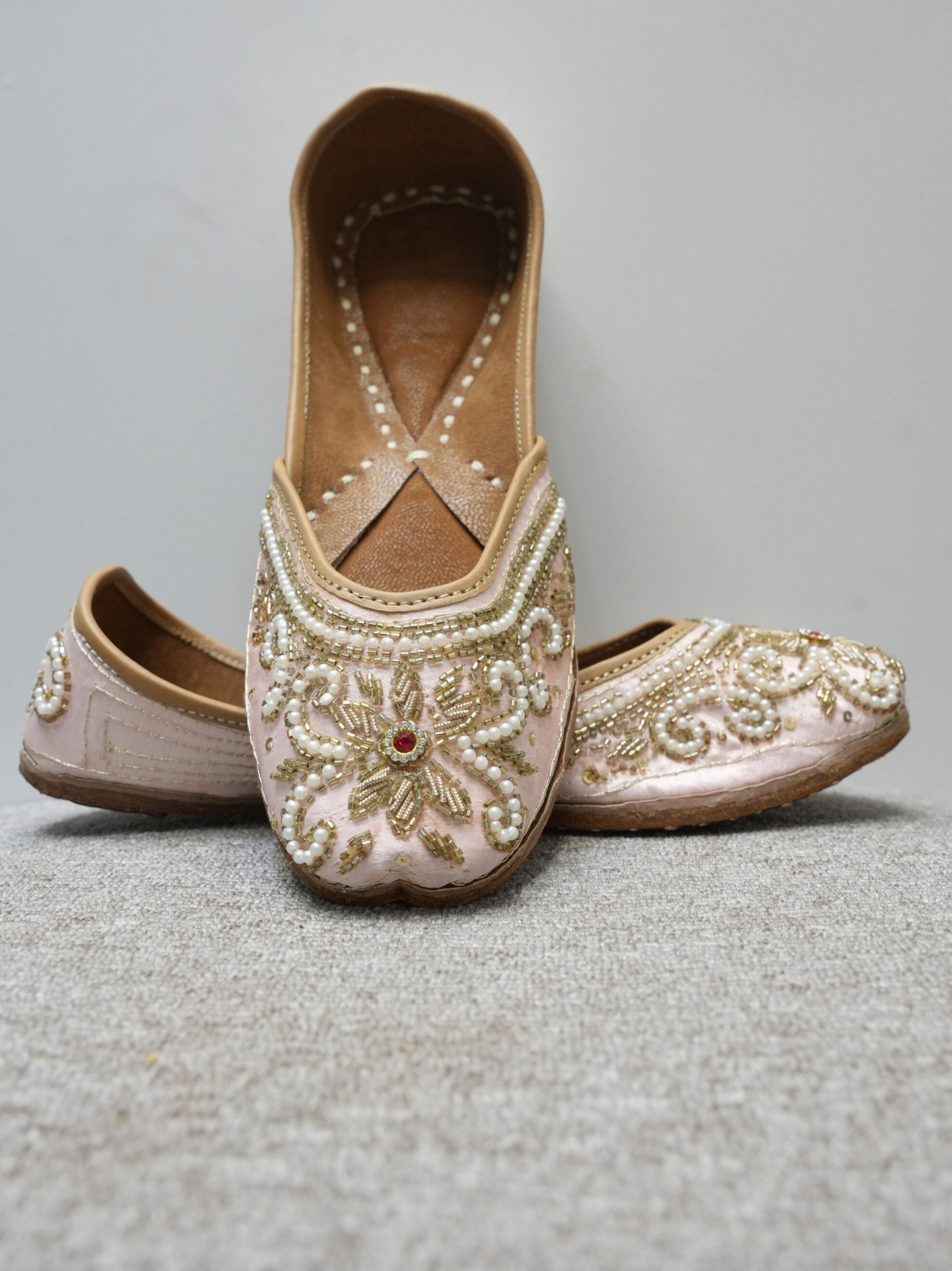 • Design: Elaborate floral and vine motif embroidery on the toe and sides, meticulously hand-stitched with golden zari thread, beads, and central rhinestone accents.