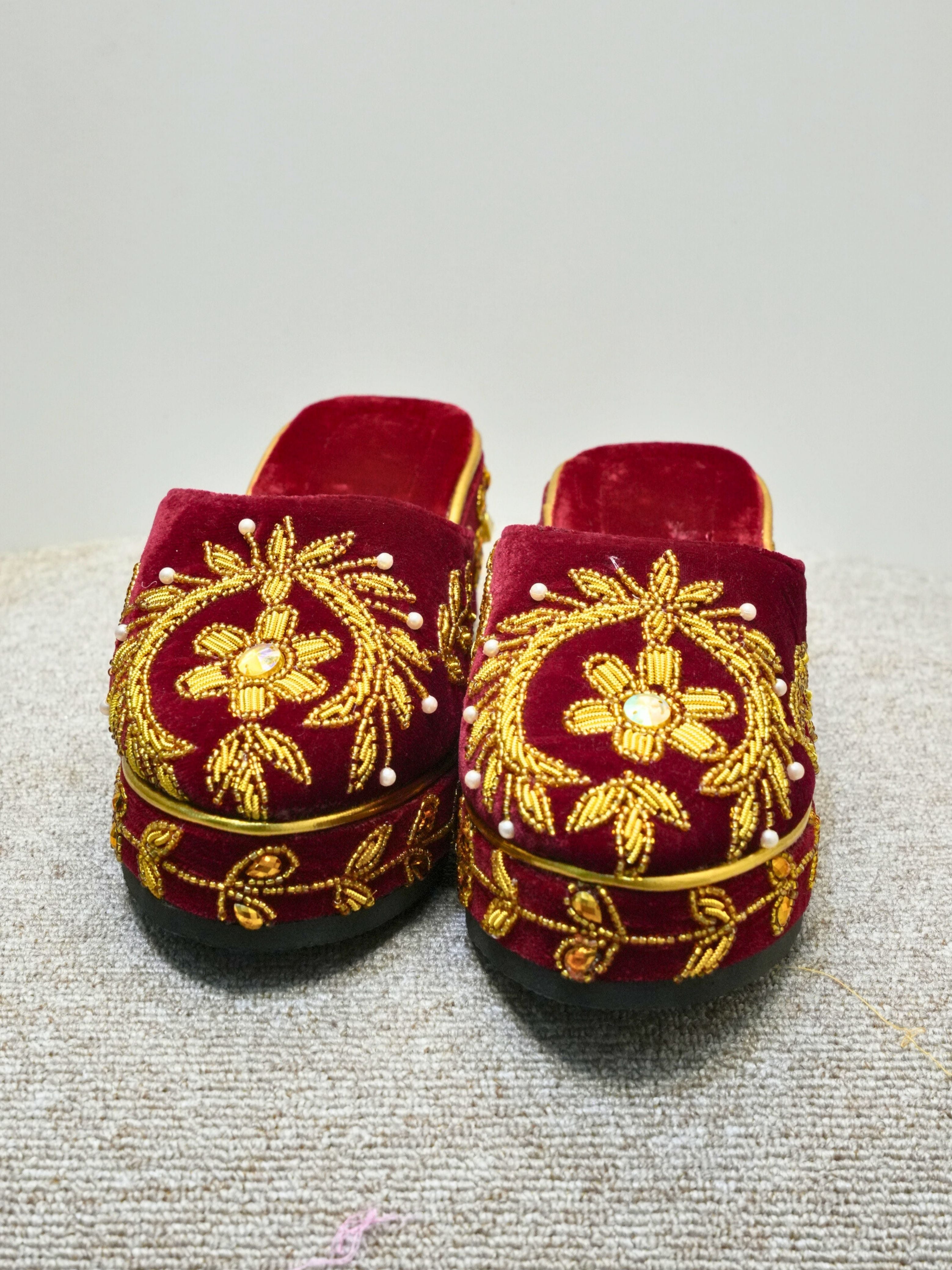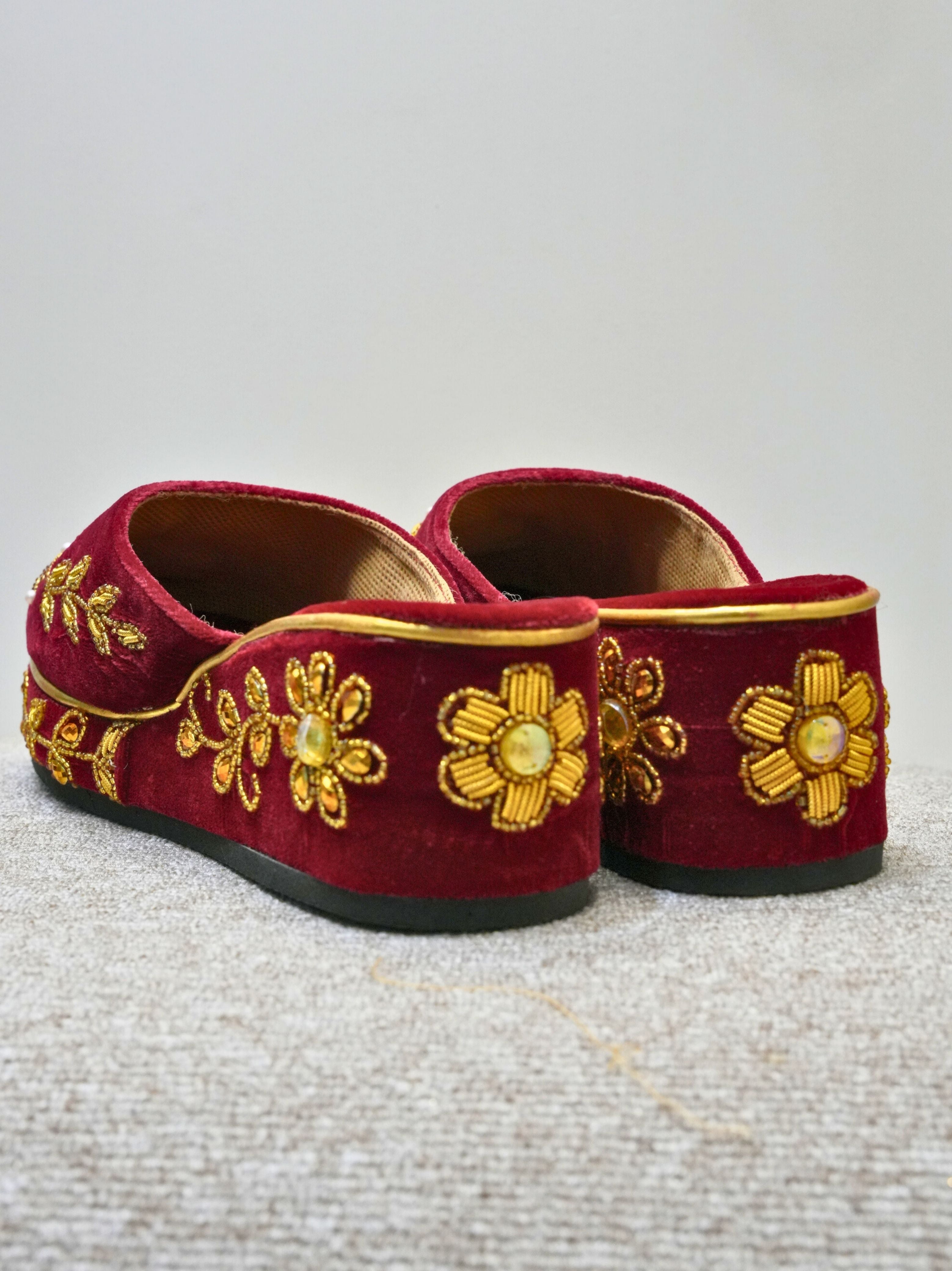 • Design: Elaborate floral and vine motif embroidery on the toe and sides, meticulously hand-stitched with golden zari thread, beads, and central rhinestone accents.