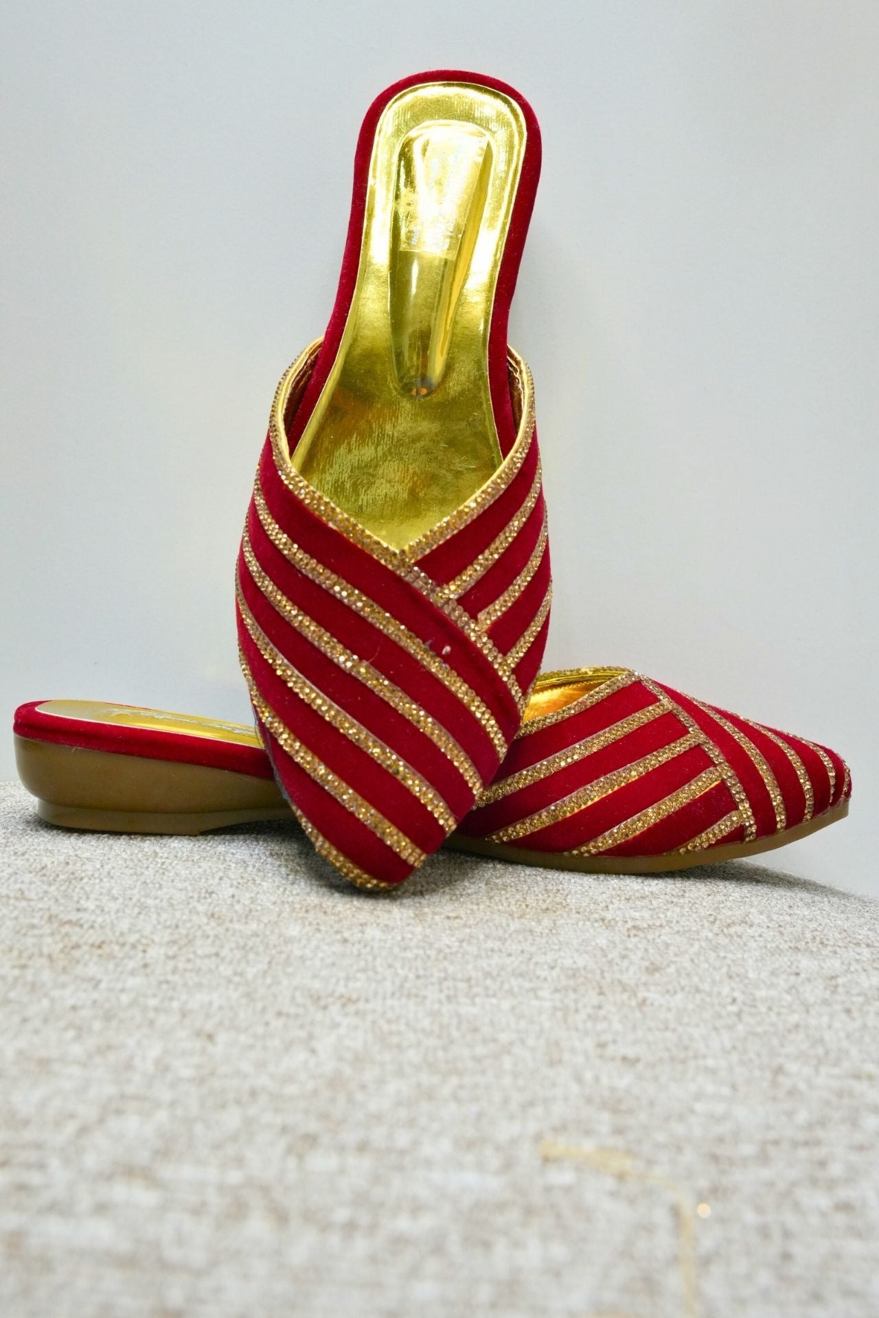 - These exquisite flats feature a rich velvet fabric in a deep red hue, beautifully contrasted with brilliant gold inner soles.
