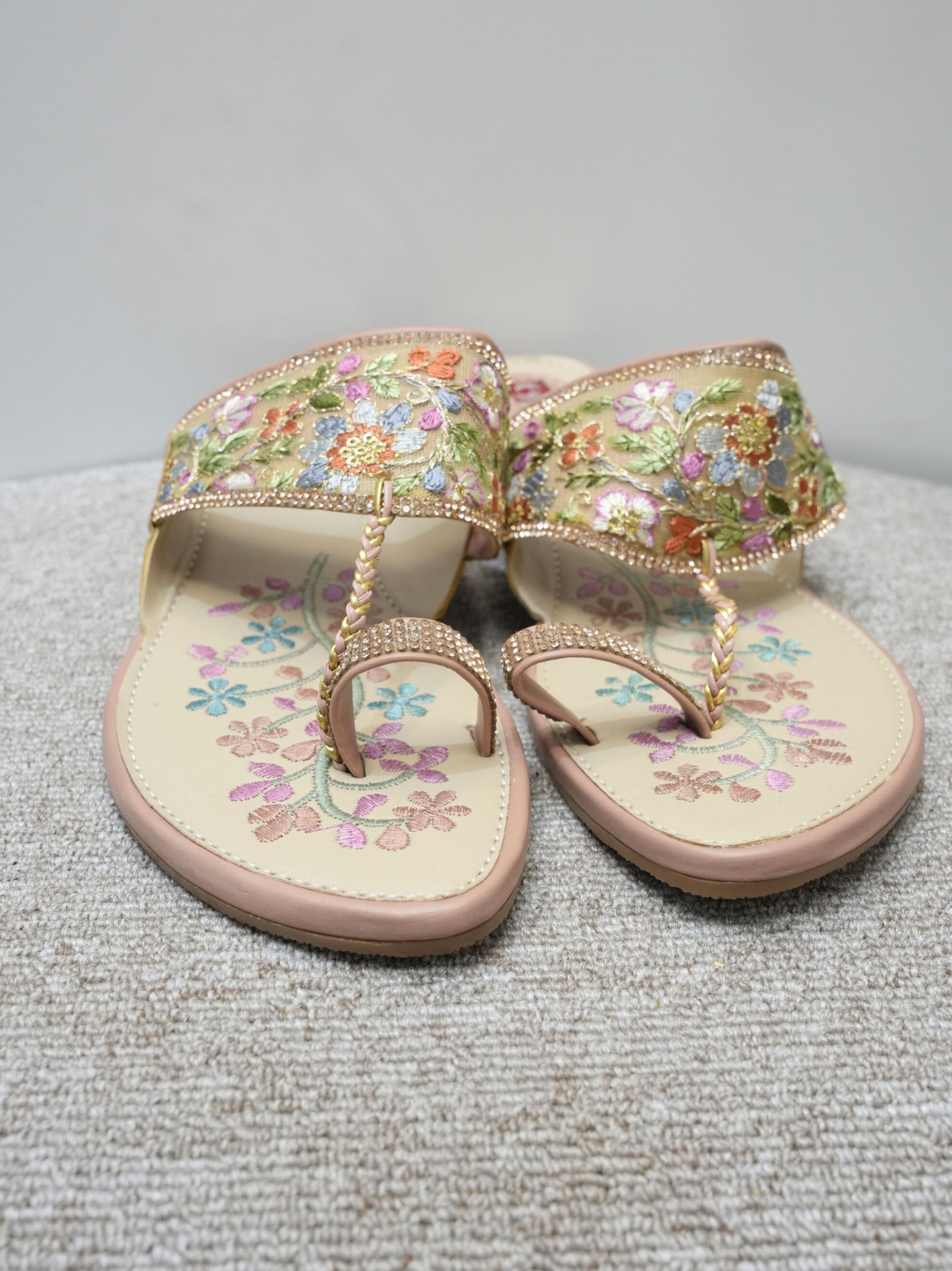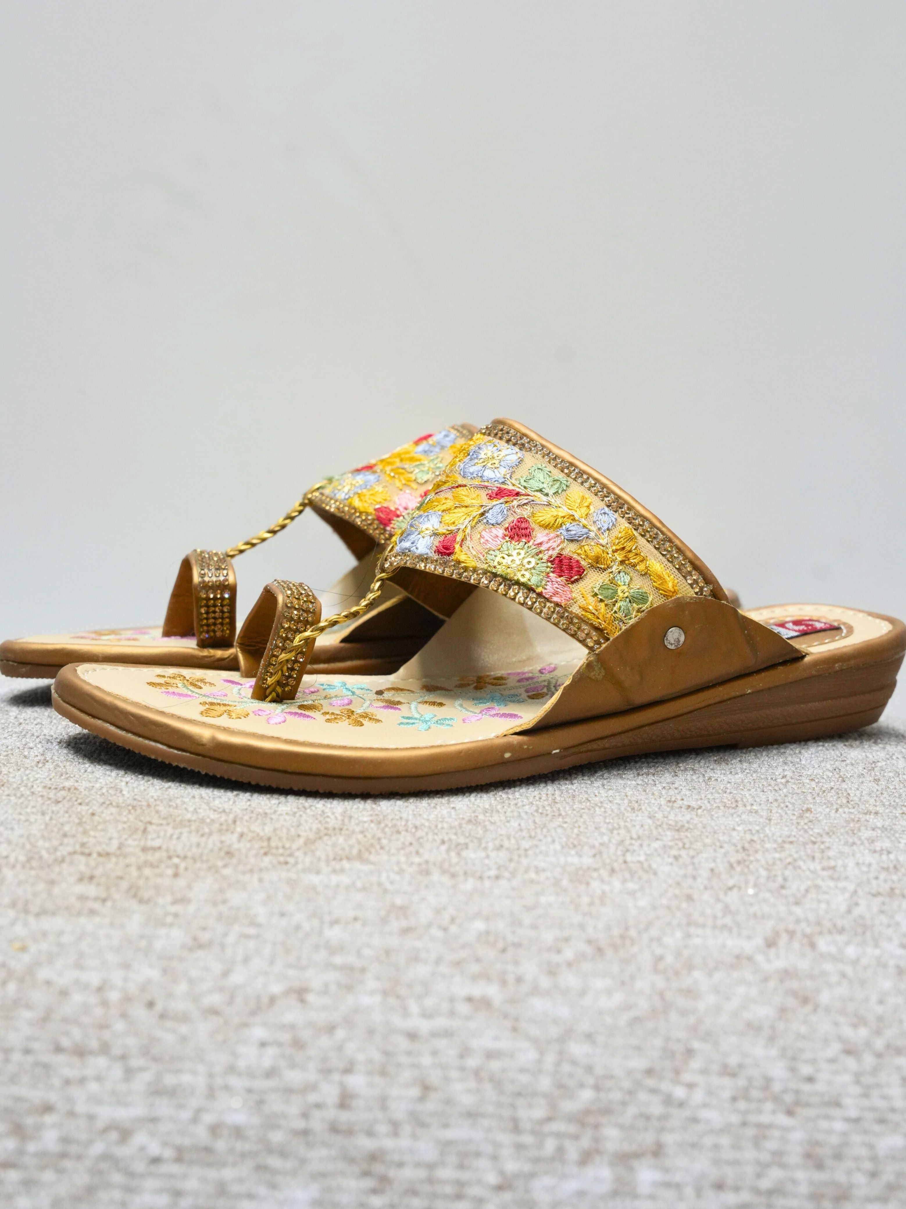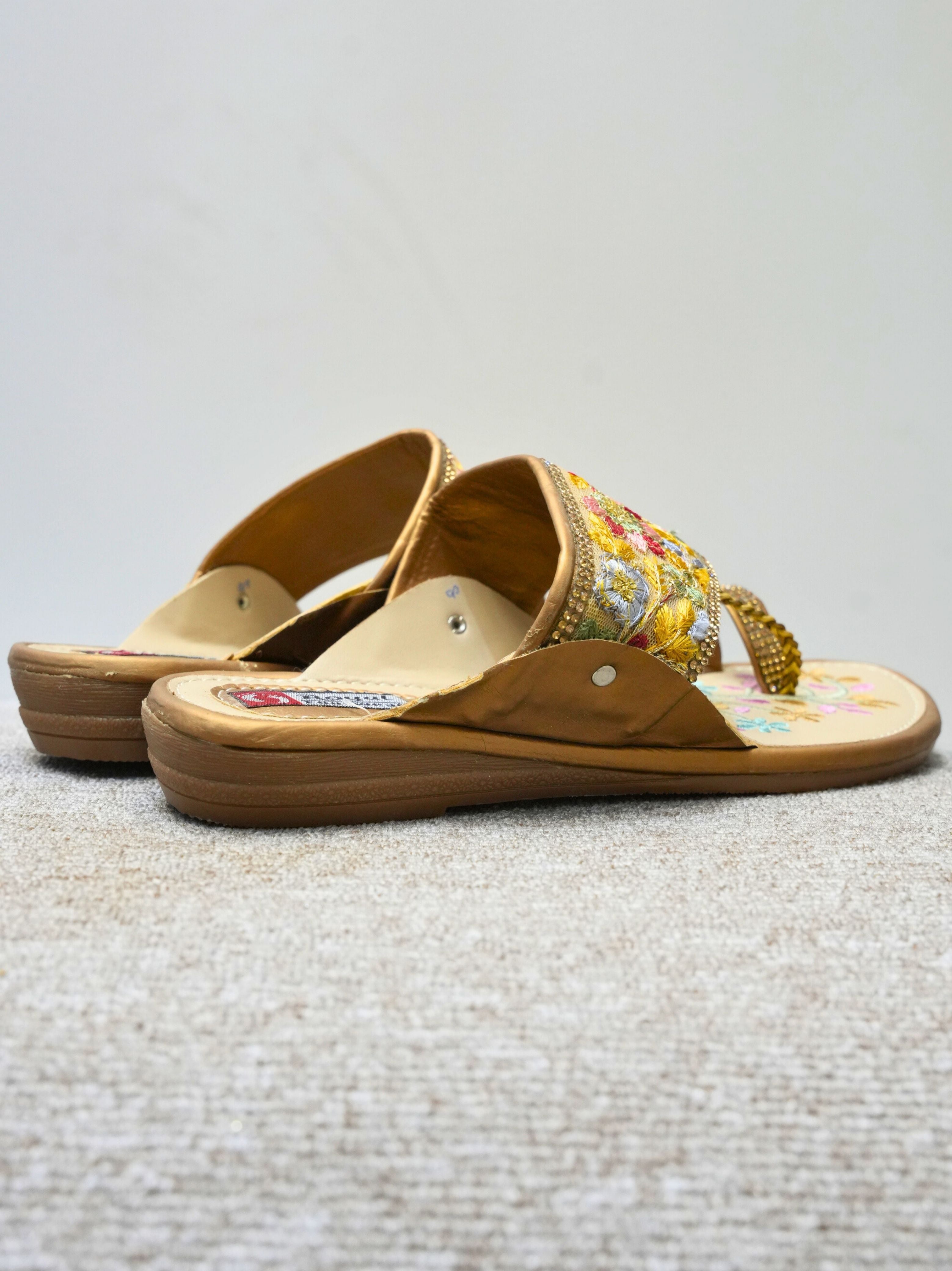 • Design: Elaborate floral and vine motif embroidery on the toe and sides, meticulously hand-stitched with golden zari thread, beads, and central rhinestone accents.