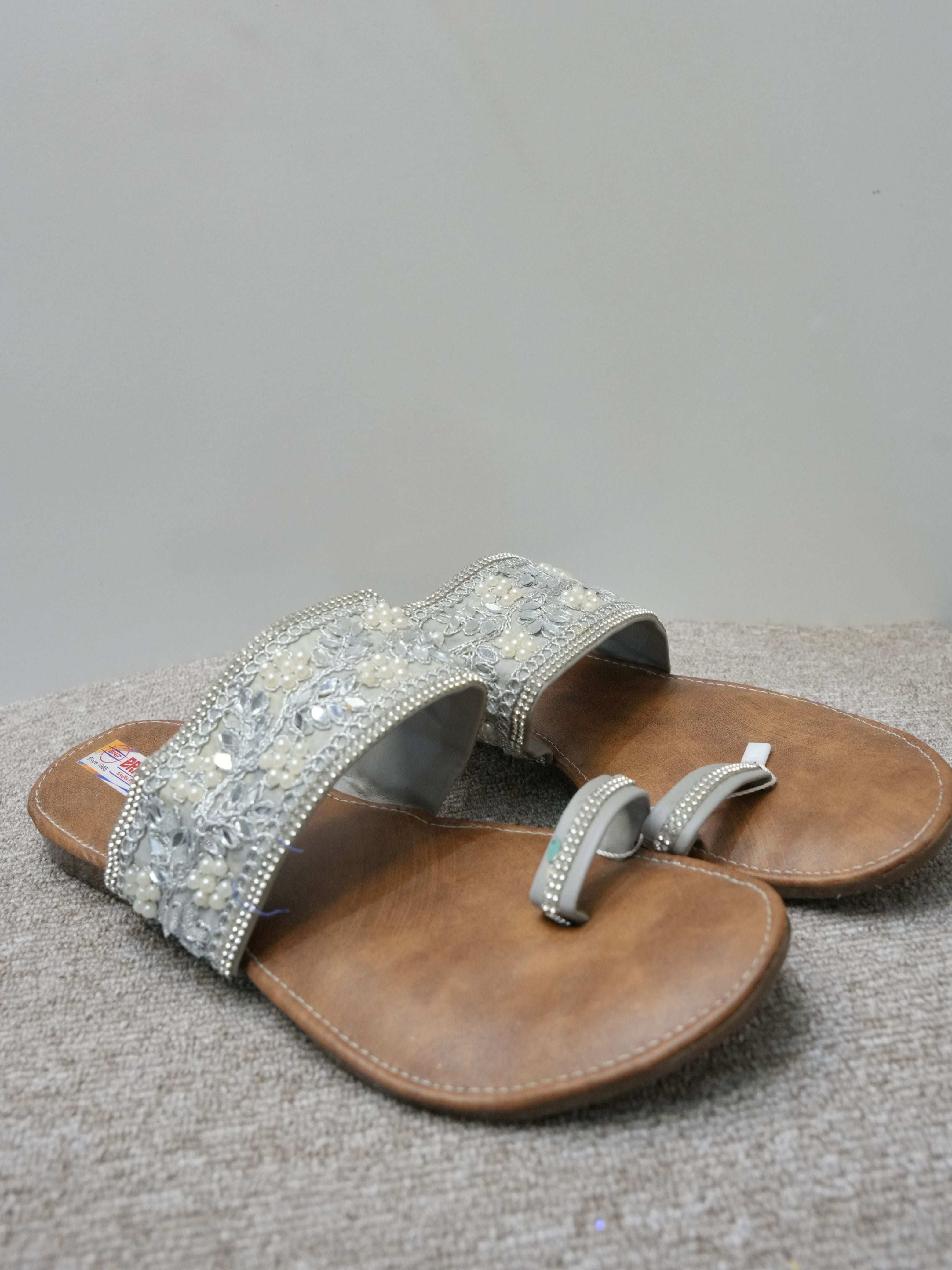 • Design: Elaborate floral and vine motif embroidery on the toe and sides, meticulously hand-stitched with golden zari thread, beads, and central rhinestone accents.