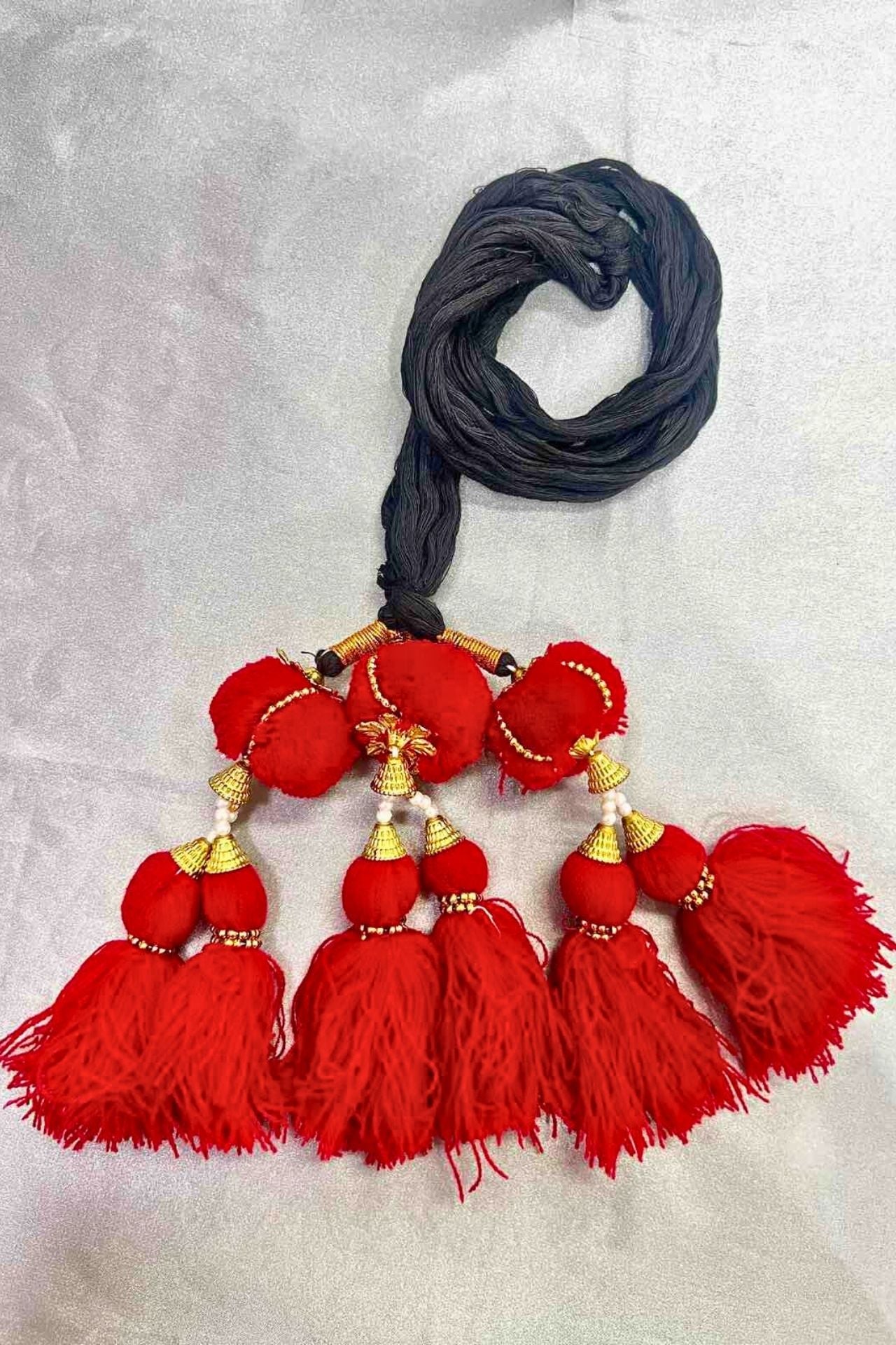 Features a soft, threaded cord finished with fluffy white wool and gold bead accents.