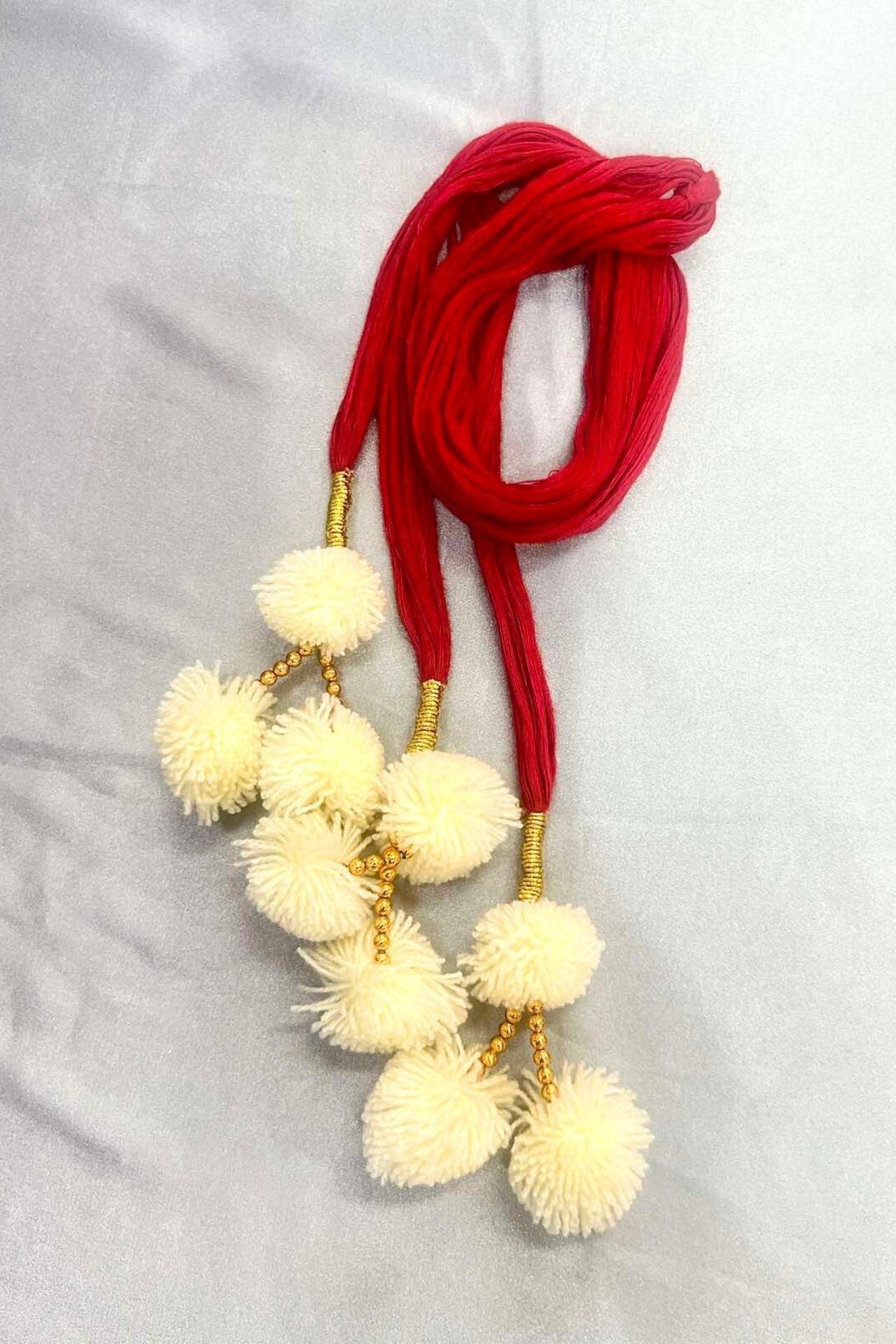 Features a soft, threaded red cord finished with fluffy white wool and gold bead accents.
