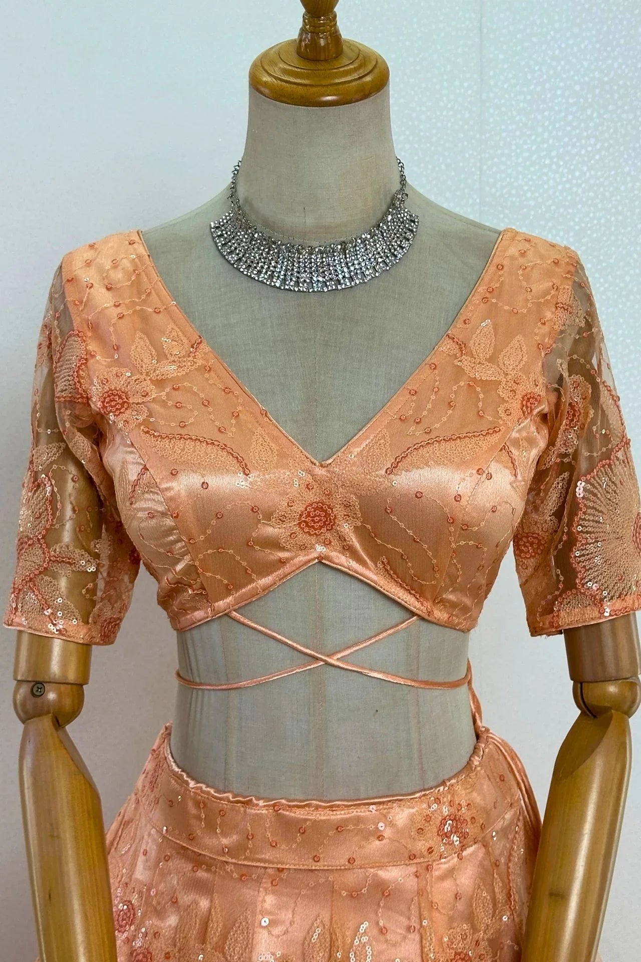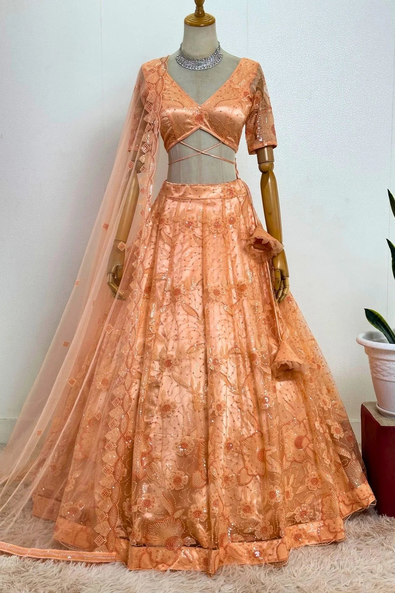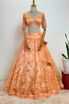 Peach Sequined Floral Net Lehenga Choli Set with Dupatta
