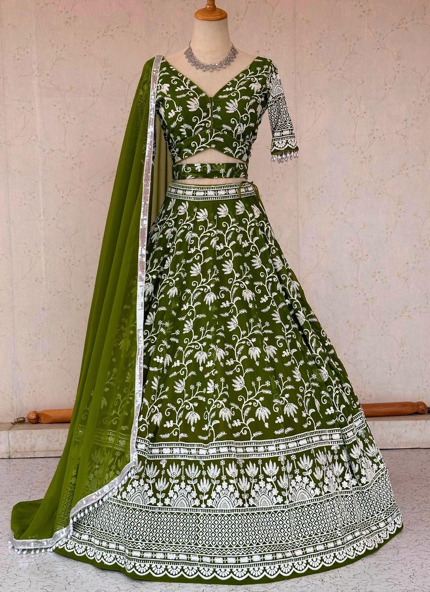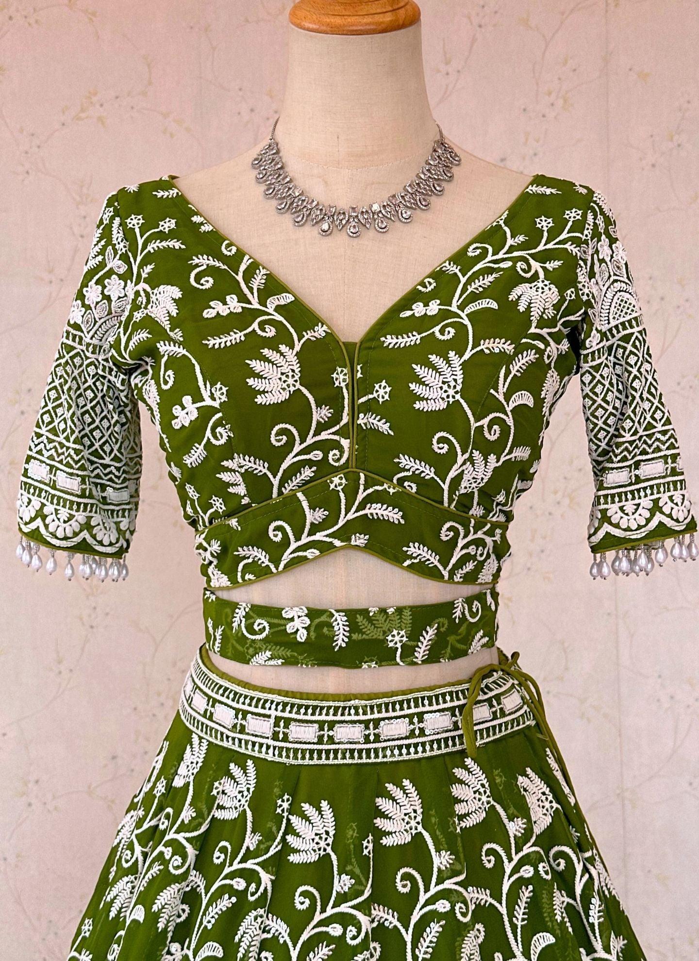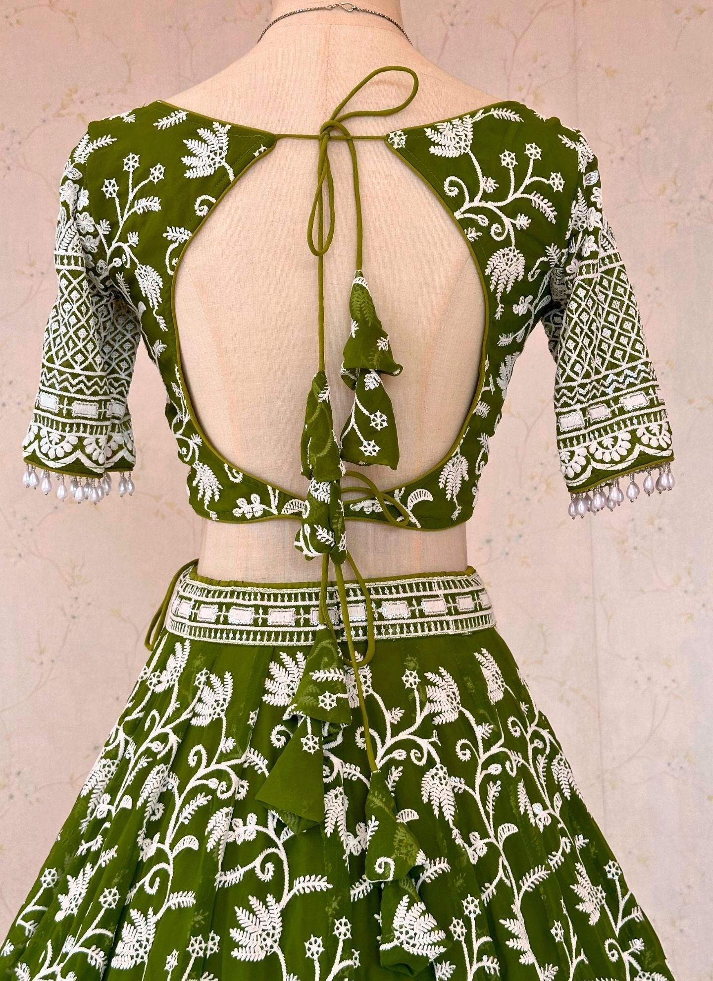 1 four layers thread embroidered lehenga (Outer fabrics in Georgette, 2 inner fabrics soft silk and crape, one cancan (hardnet). Lehenga Skirt has string with tassel for Adjustment of waist.