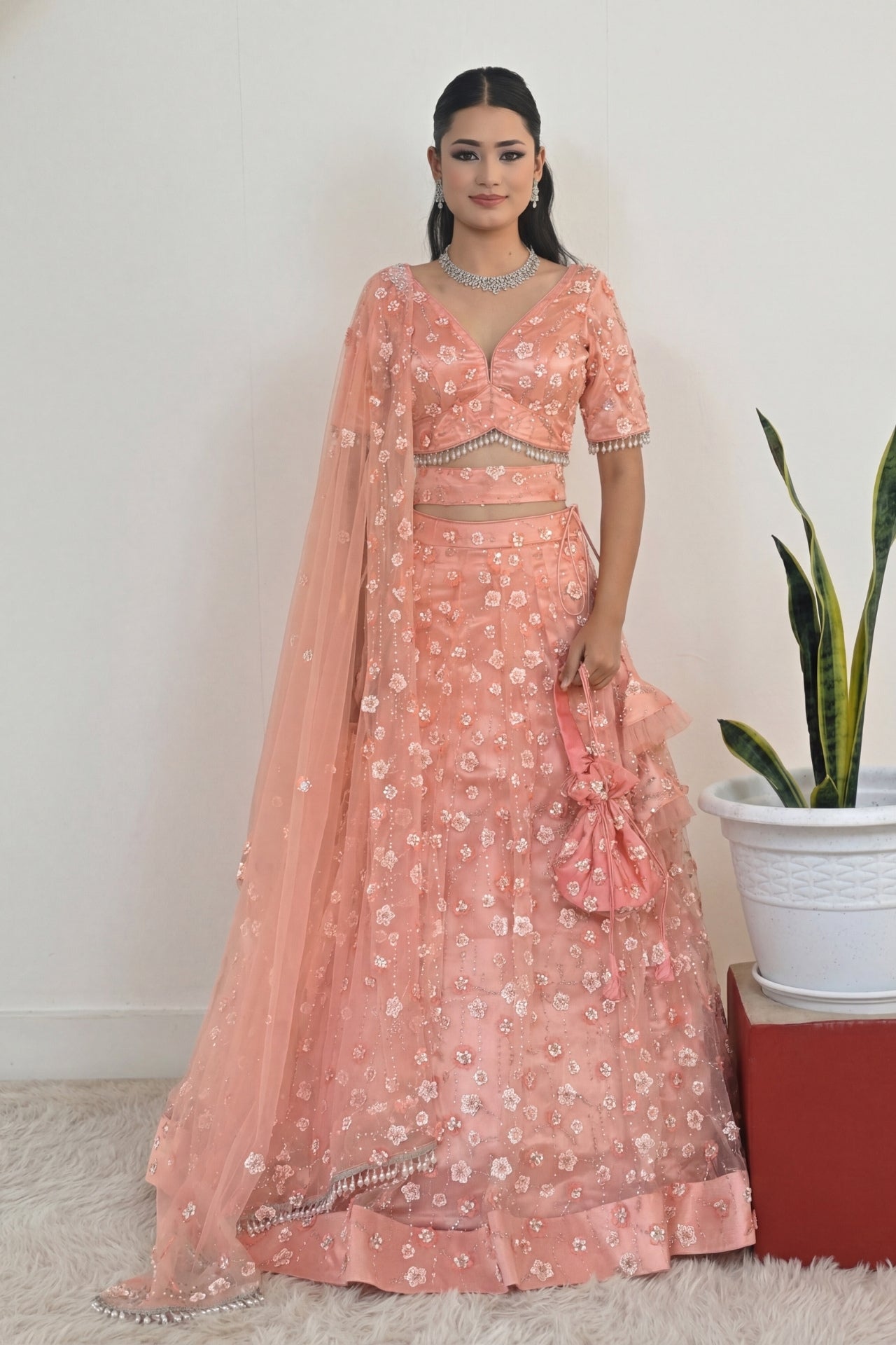 Design: Features intricate floral embroidery and shimmering sequin work across the fabric, complemented by a delicate bead-fringe border on the blouse and dupatta.